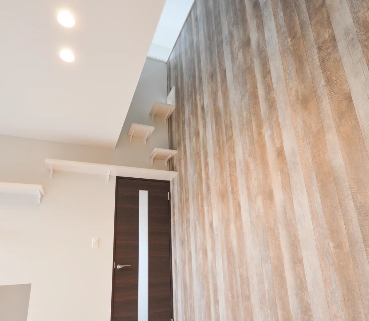 高いところを好む猫のために、リビングから吹き抜けの壁面を通り、2階へ行き来できるキャットステップを設置。厚みのある板をL字フックで固定するシンプルな構造ですが、猫の視点で設計された動線によって、愛猫も大満足の空間となっています。