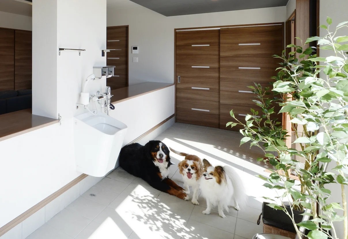 ドッグランから室内に入ると、犬専用の土間スペースがあります。備え付けのスロップシンクで汚れものを洗ったり、タイル張りの土間でシャワーを浴びさせたり、ペットのケアがスムーズに行える間取りです。