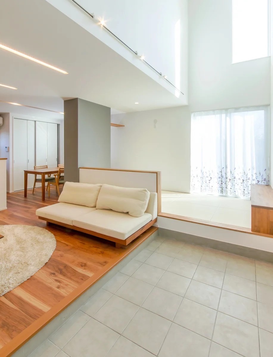小上がりに腰掛けて土間を使うこともでき、それぞれの空間を拡張することも可能です。リビングと土間を一体化させながらも、それぞれの空間で異なる楽しみ方ができます。