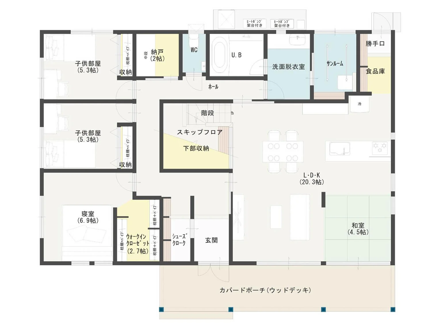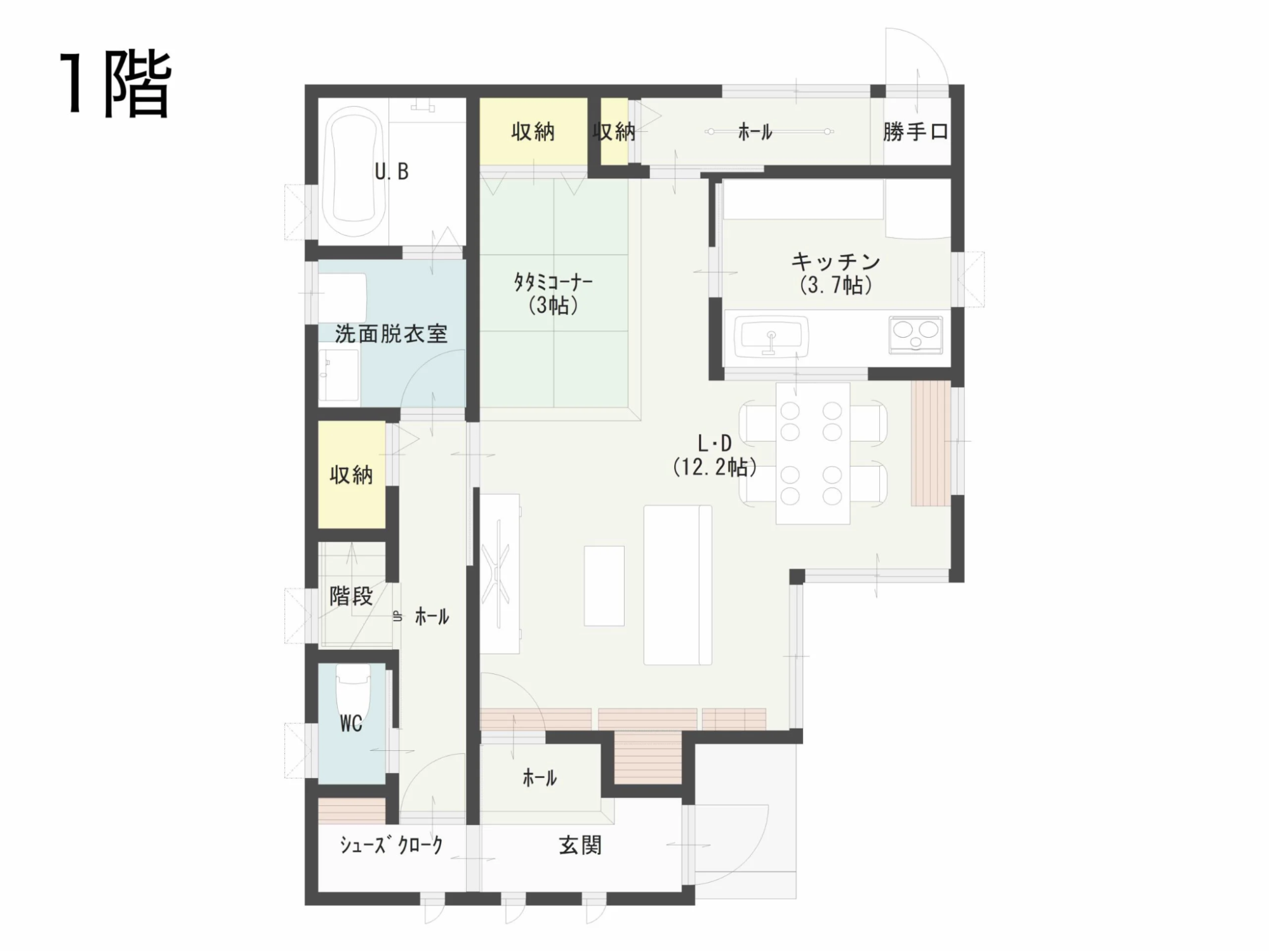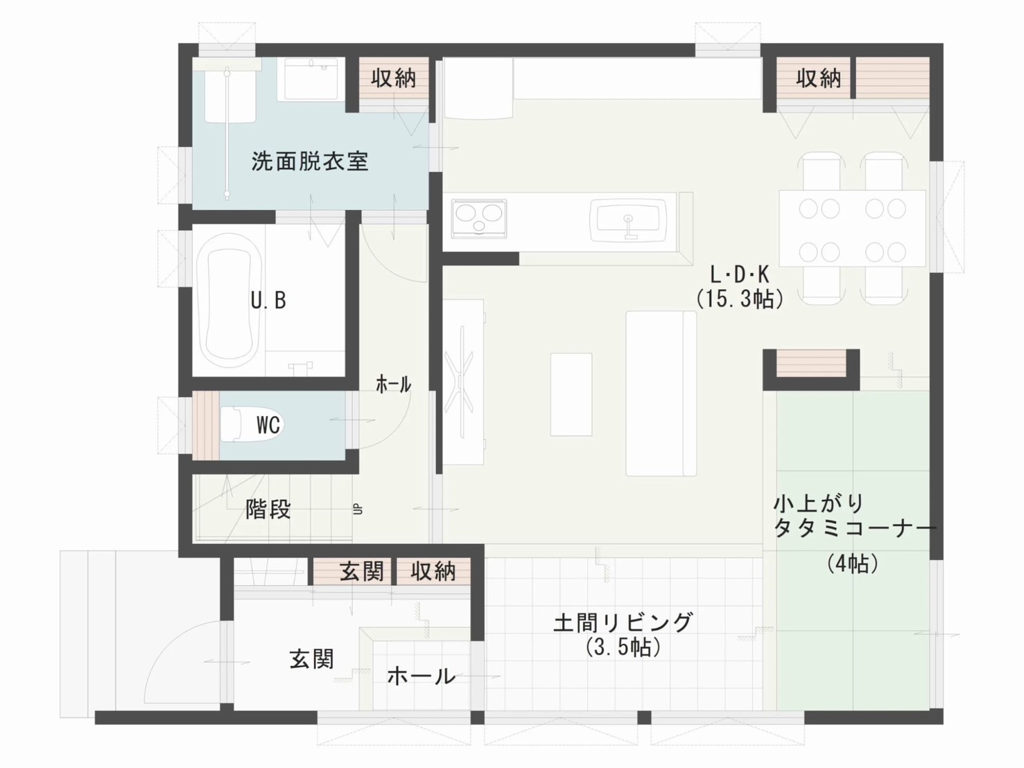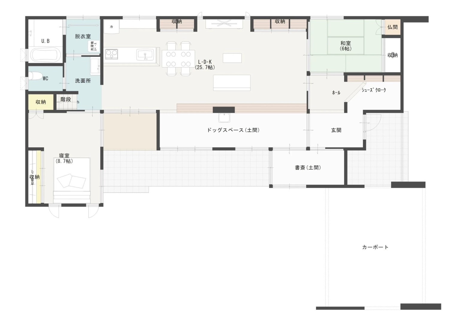また、子供たちの遊び場として、あるいは玄関に近いという立地を生かし、アウトドア用品や季節のものを収納するスペースとしても便利です。