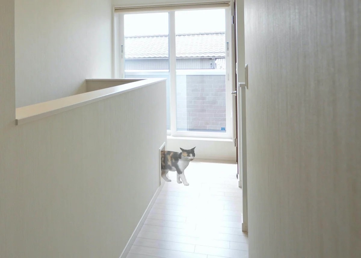 特に注目したいのは、1階のトイレスペースから、2階のホールへと繋がるキャットステップの動線です。吹き抜けの壁には猫用の出入り口が設けられていて、猫専用の通路となっています。