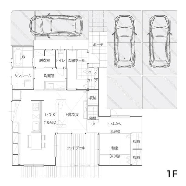 ガレージは、2台駐車可能な最小限の広さで設計されています。シャッターで閉めることで、愛車を雨風や雪から守り、常に清潔な状態で保つことが可能です。
