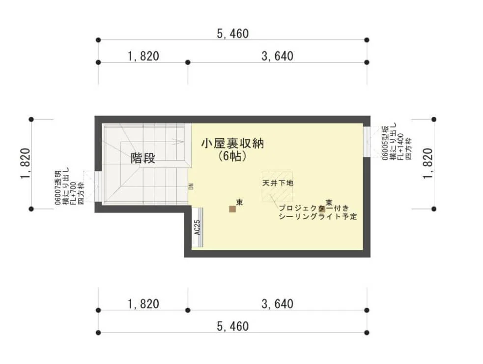 こちらは、縦に空間を広げた2階建ての間取りです。屋根裏空間まで、縦に空間を広げて活用することで、狭小地でも広々とした住まいを実現しました。