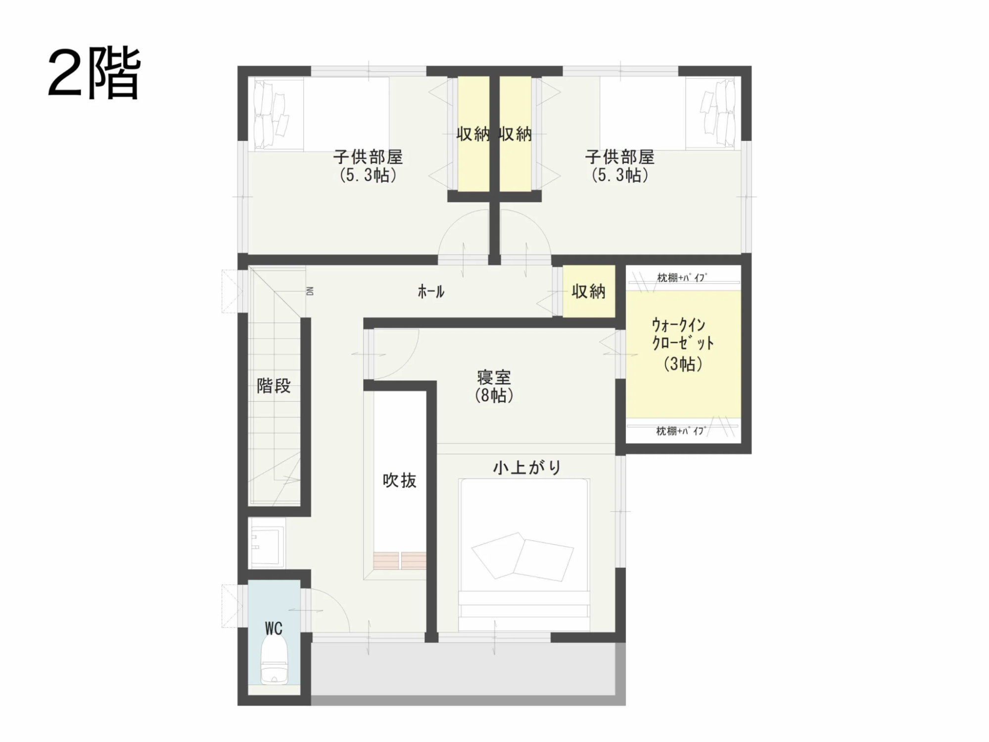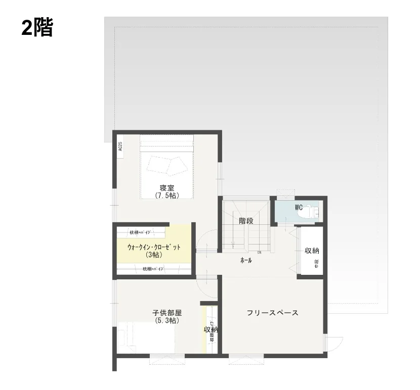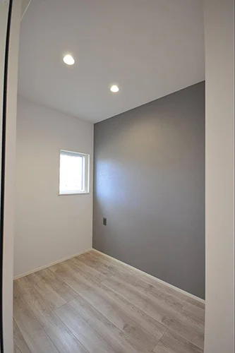 2階は、寝室と2室分のスペースが繋がった大きな子供室に。子供が小さいうちは、家族みんなで寝たり、兄弟で広く遊べる空間として活用できます。将来、子供が成長し個室を希望するようになった場合でも、簡単に部屋を分けられるので、家族構成の変化に柔軟に対応できる間取りです。