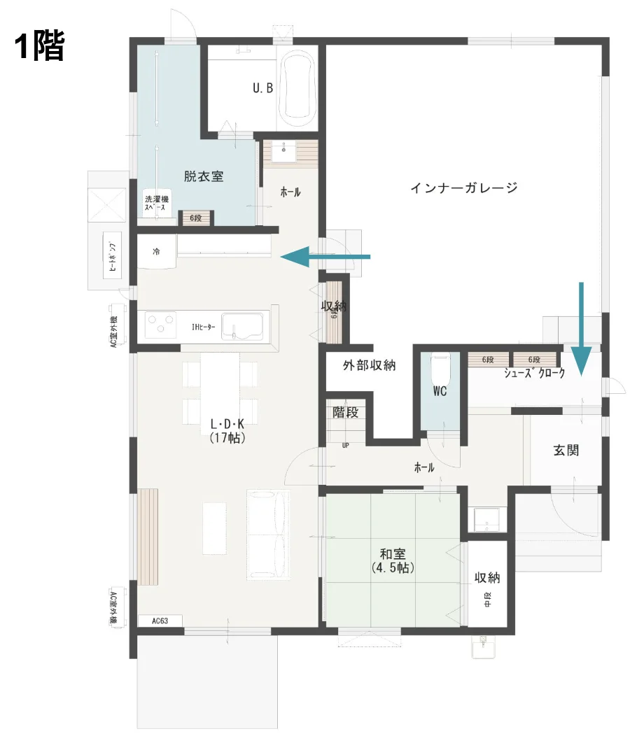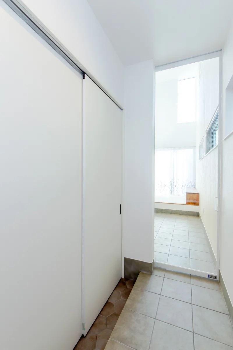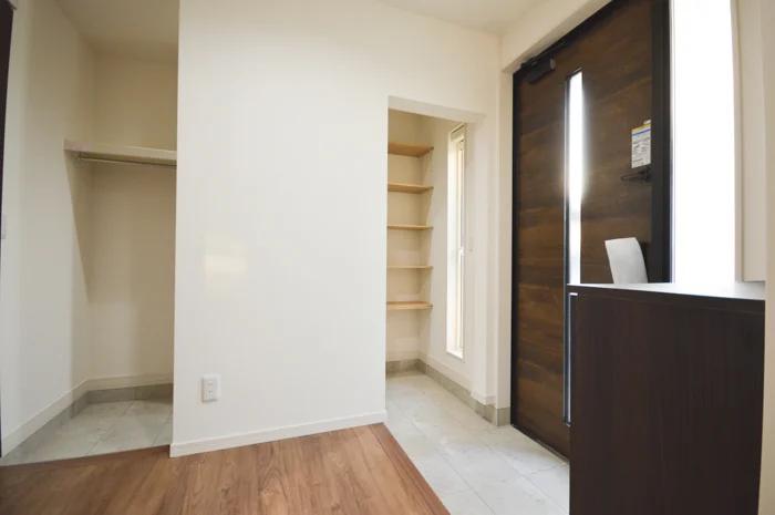 さらに、奥にはシューズクロークと家族用の玄関動線がある点も特徴です。来客時と家族の動線を分けることで、プライバシーも確保しています。洗面台や水回りも近くに配置され、帰宅後の家事動線もスムーズです。