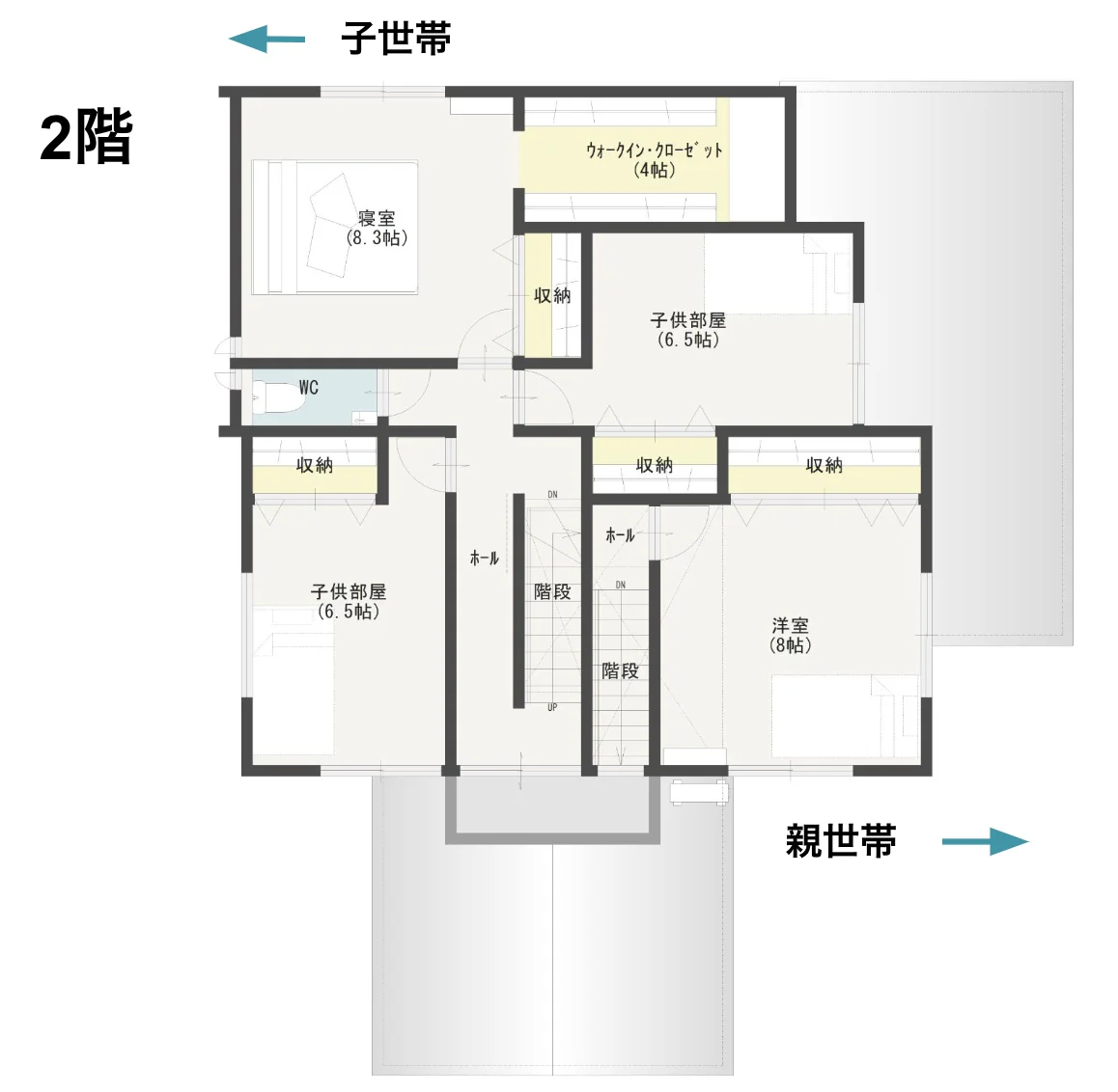 こちらは、親世帯と子世帯がそれぞれ独立した生活を送れる、完全分離型の二世帯住宅の事例。大きくなりがちな二世帯住宅を、総二階でなるべく建築コストを削減したい場合に人気の間取りです。