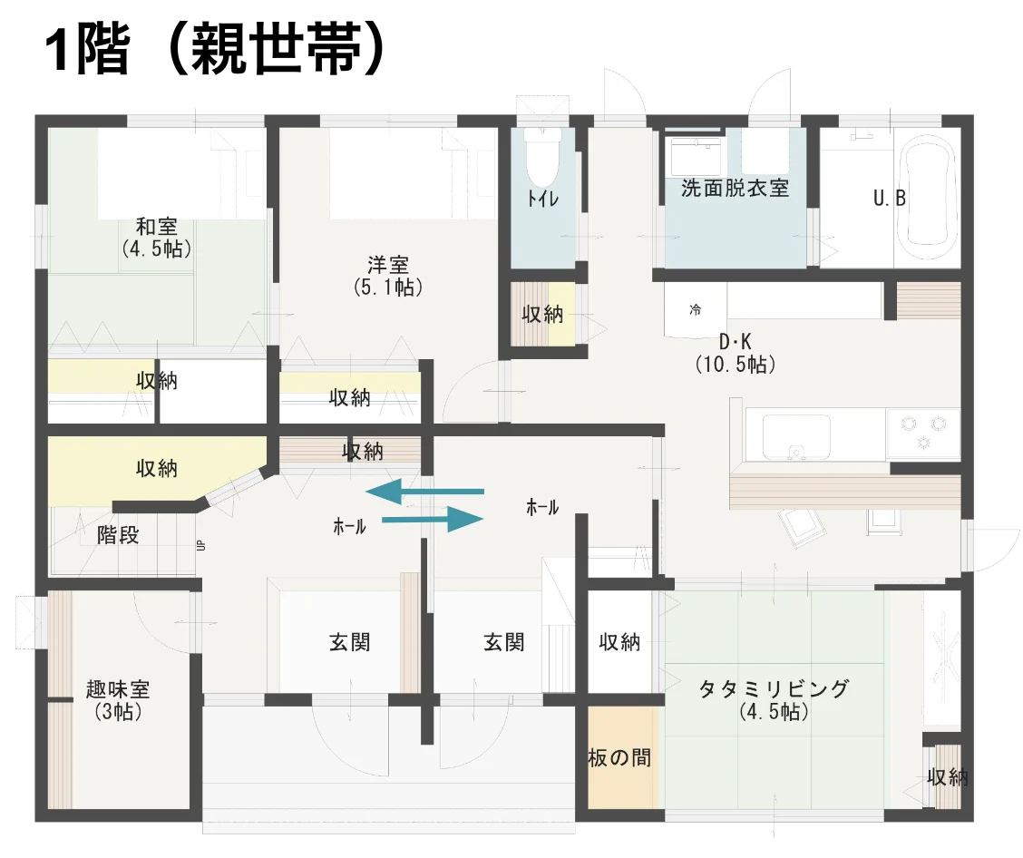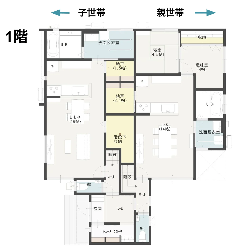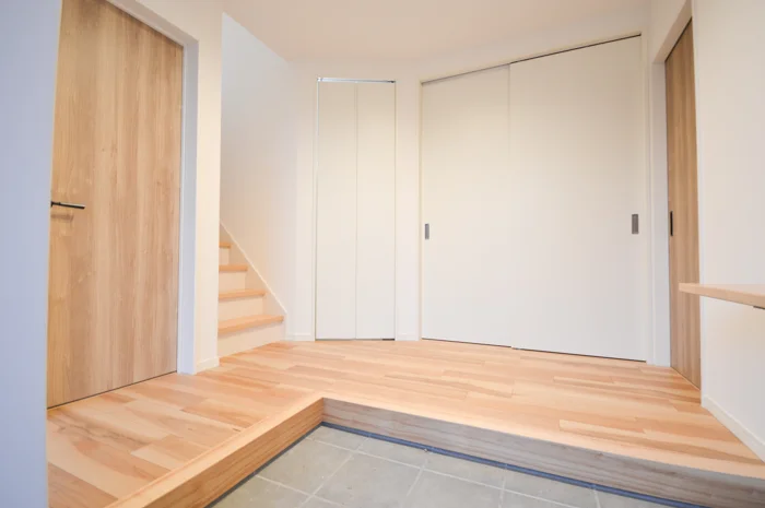 玄関を共有することで、建築コストを抑えつつ、それぞれの世帯が独立した生活を送れます。共用の玄関には大容量のシューズクロークを設置。靴やその他の収納物をスッキリ収納できる作りとなっています。