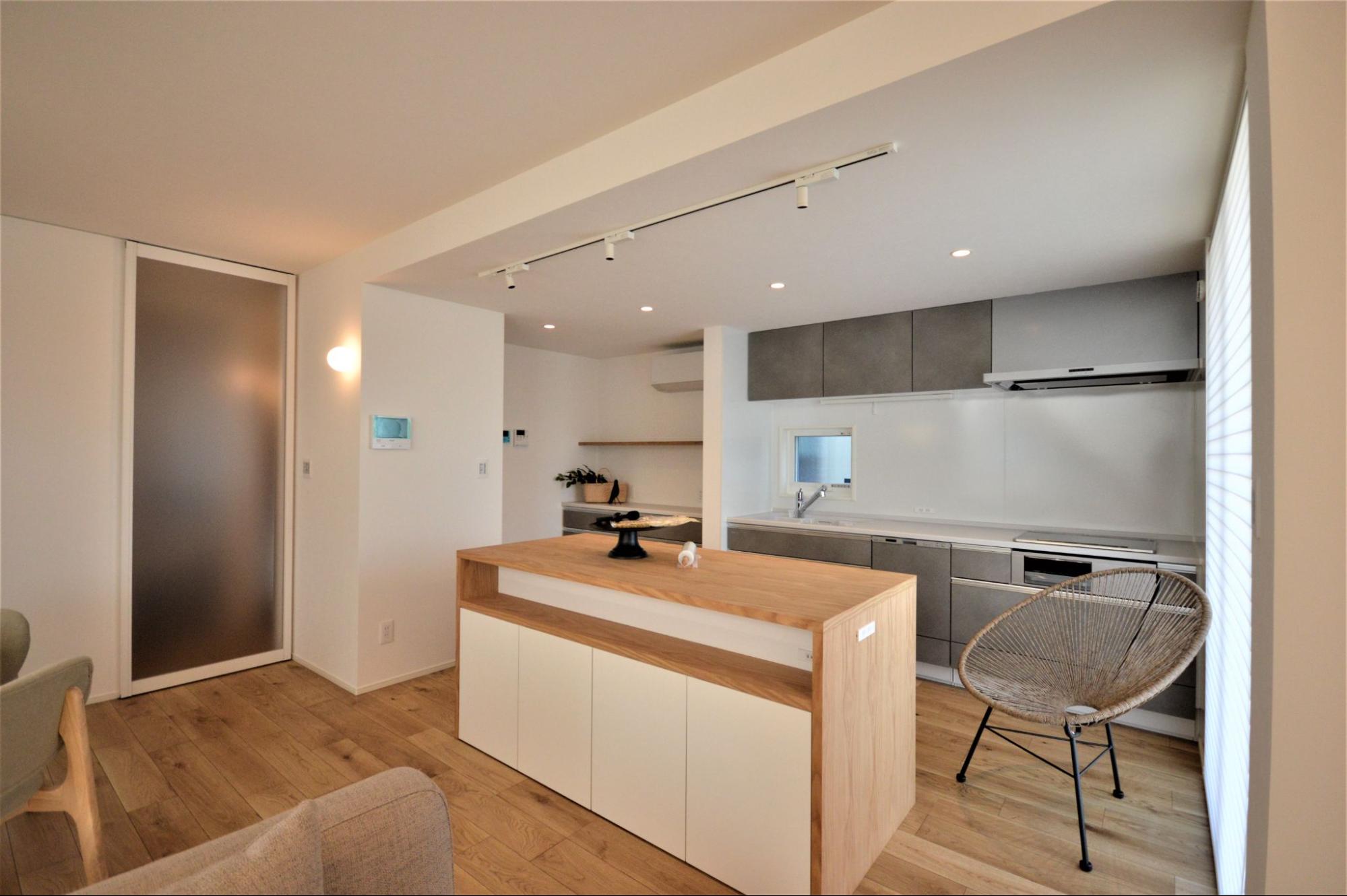 内装は北欧インテリアらしい、温かみのある木質素材やベージュ系の壁紙を使用。落ち着いた雰囲気のカフェのようなキッチンも実現しました。キッチン裏には水回りを配置し、家事動線もスムーズです。