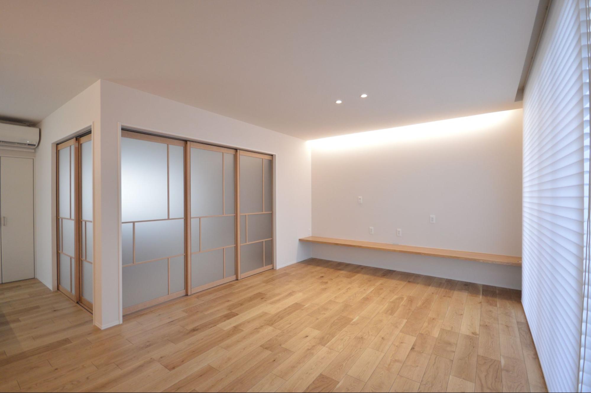 ベッドルームは、シンプルな空間にアクセントとなる造作のヘッドボードを設置。