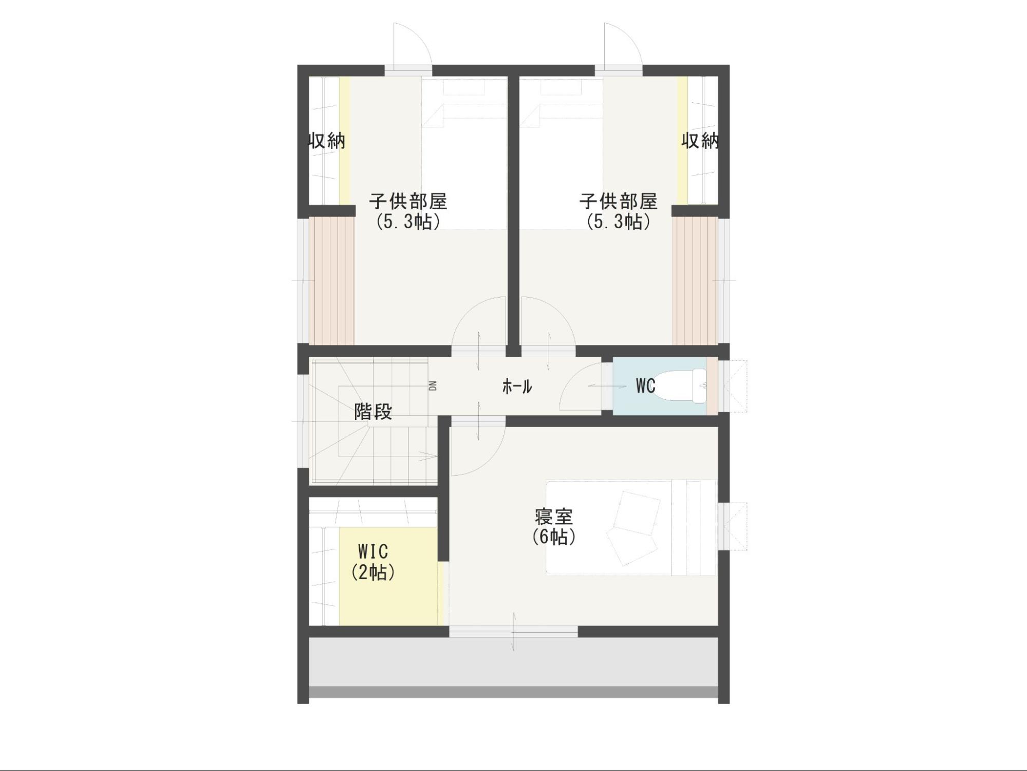 2階に3つの居室をまとめ、1階部分を水回りとLDKに配置。広いリビングを確保した開放的な設計が特徴です。