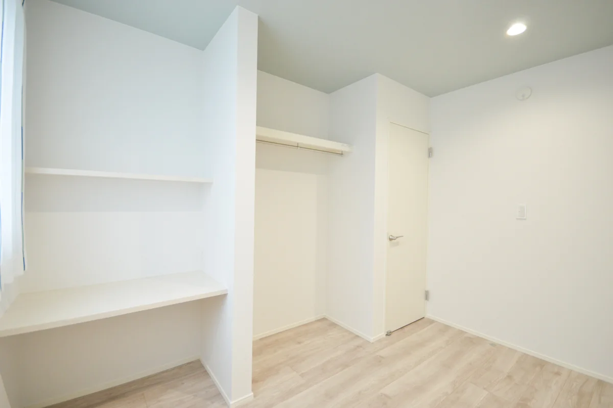 収納はコストダウンと開放感の両立を目指し、建具は設置せずオープンな空間を演出しています。将来的には、ロールスクリーンを設置し、目隠しや収納スペースの追加もできるつくりとなっており、柔軟性が高い点も魅力です。