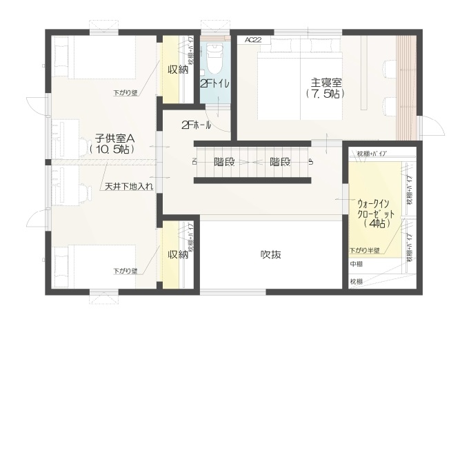 コンパクトで使い勝手の良い間取り事例です。勾配天井や吹抜けの使い方が特徴的な空間になっており、ゆとりと個性があります。