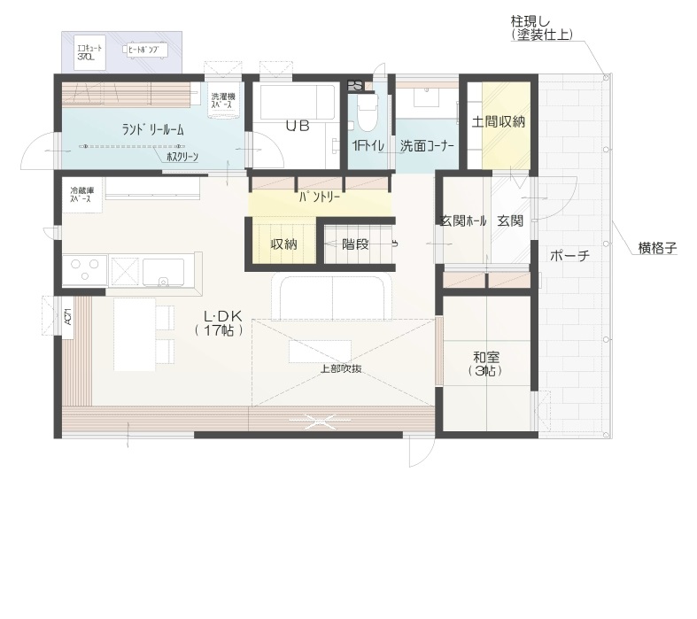 コンパクトながらも、1階に水回りとリビングを設置した間取り事例です。ガス乾燥機を設置したことで、洗濯物が多くても、部屋干しスペースを広く取れなくても、洗濯物を干す手間と時間を減らせるようになっています。