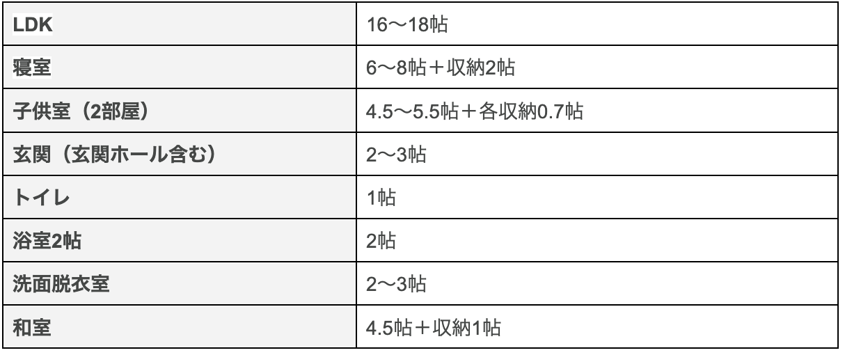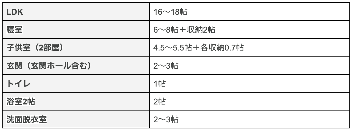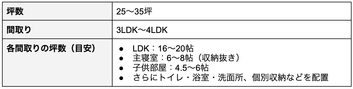 4人家族で住む一軒家で必要な広さの目安は次の通りです。