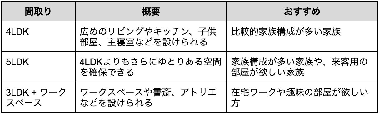 40坪の間取りは、家族構成やライフスタイルによって様々ですが、以下のような間取りが一般的です。