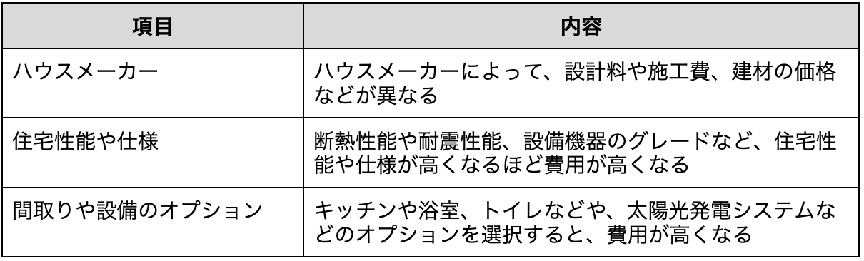 注文住宅の費用は、面積が同じでも、以下の要素によって変動します。