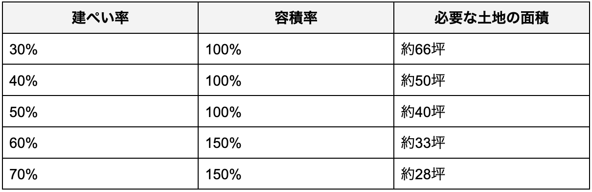 例えば40坪(1階20坪、2階20坪)の家を建てる際、必要な土地の面積は以下のような割合で決まっています。