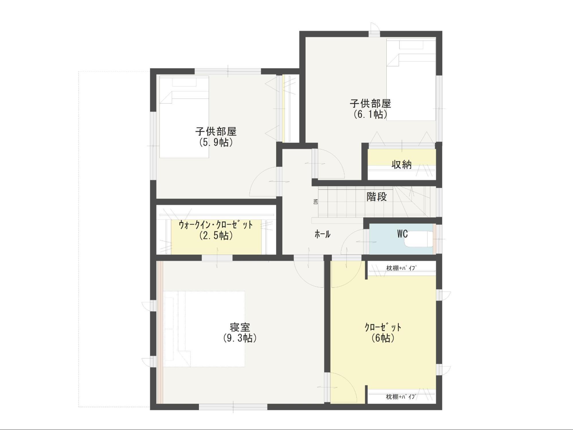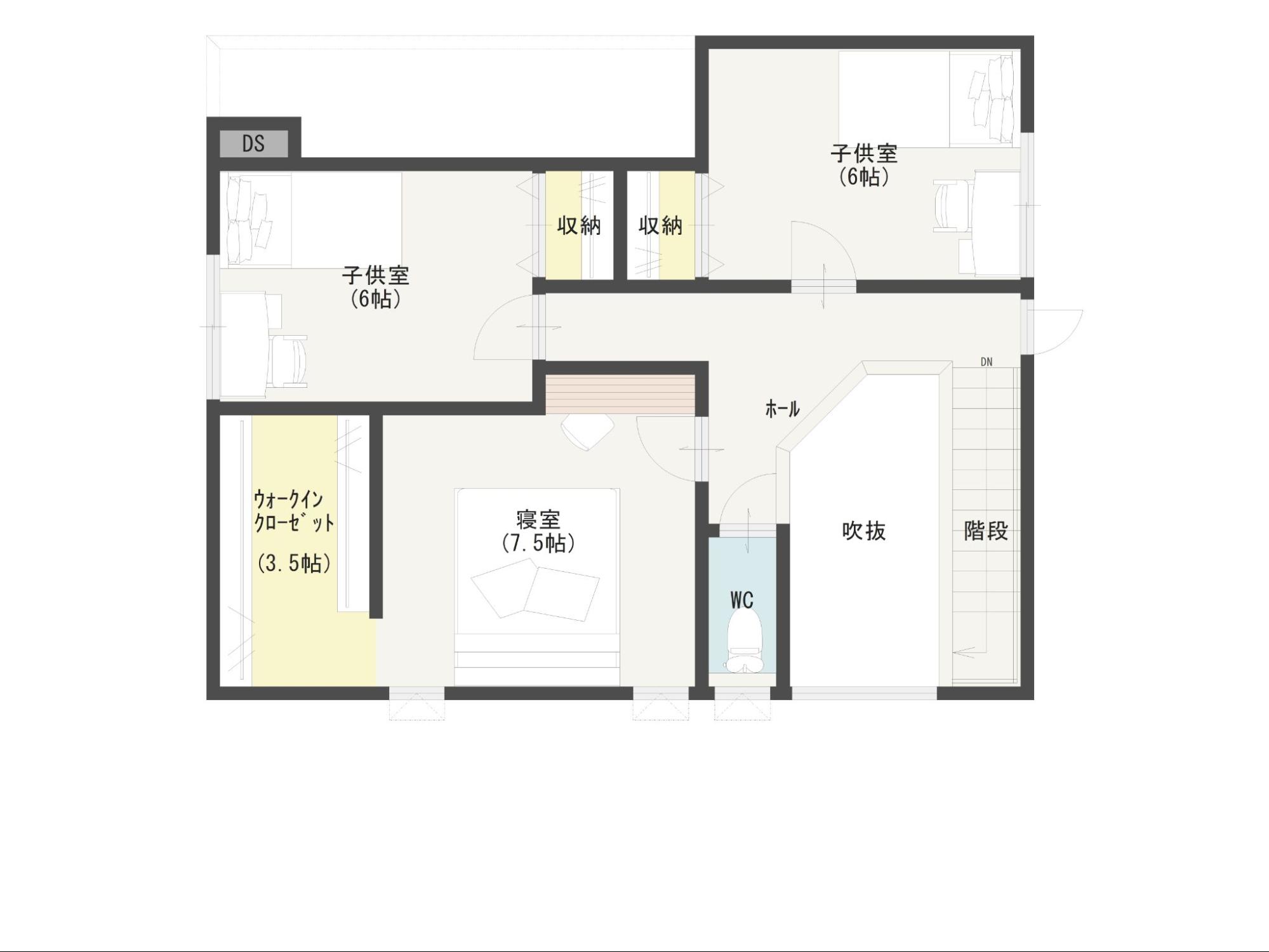 2階には、主寝室、子供部屋3部屋、小屋裏収納、トイレ、ウォークイン・クローゼットが設置されています。