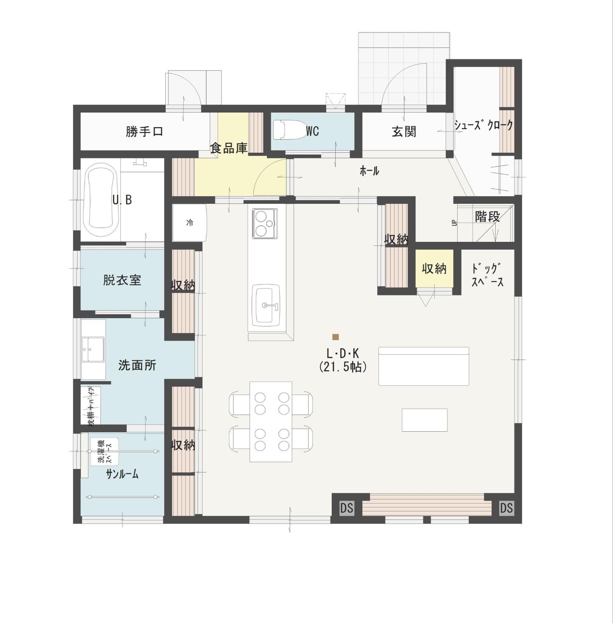 サンルームやファミリークロークが隣接されており、移動の負担に配慮されています。家事をしながら洗濯などの他の家事もしやすく、回遊できるので移動もスムーズ。洗面脱衣室と洗濯機置き場がまとまっている点も特徴です。