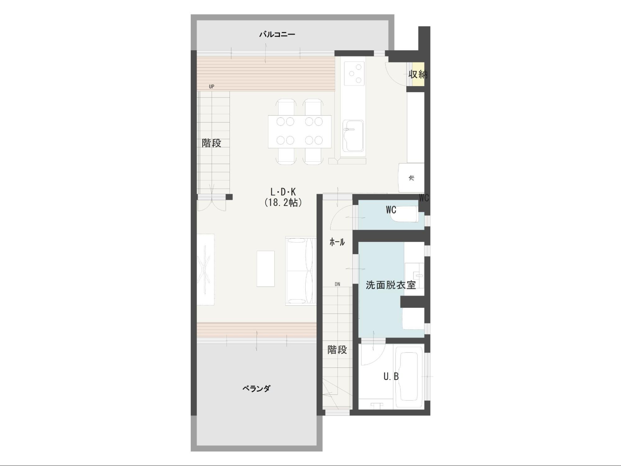 LDK は18.6帖と広く、家族みんなでくつろげる空間に。リビングダイニングと一体化されています。