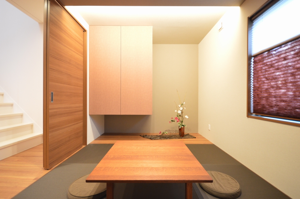 琉球畳を採用し、天井には間接照明を取り入れ、現代的な雰囲気に仕上げた和室の事例です。特に目を引くのは、間接照明が照らした先にある吊り収納と、クロス仕上げの造作建具。