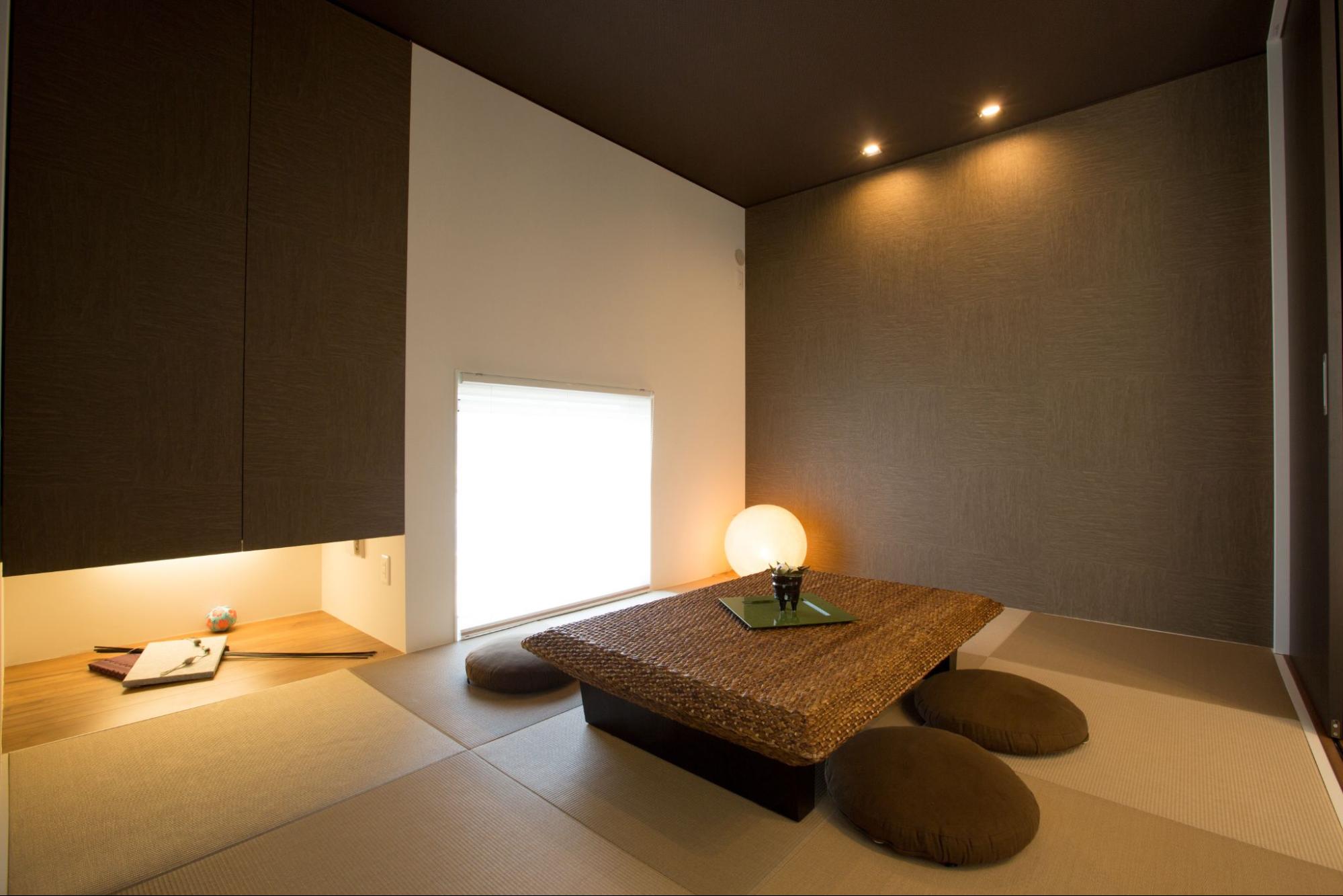 こちらの和室は、暗めのクロスと照明によって、居酒屋のような落ち着いた雰囲気を醸し出している事例です。大人の隠れ家といった趣きもあります。和室内には窓もあるので、日中は十分な明るさも確保。開放感も感じられる間取りです。