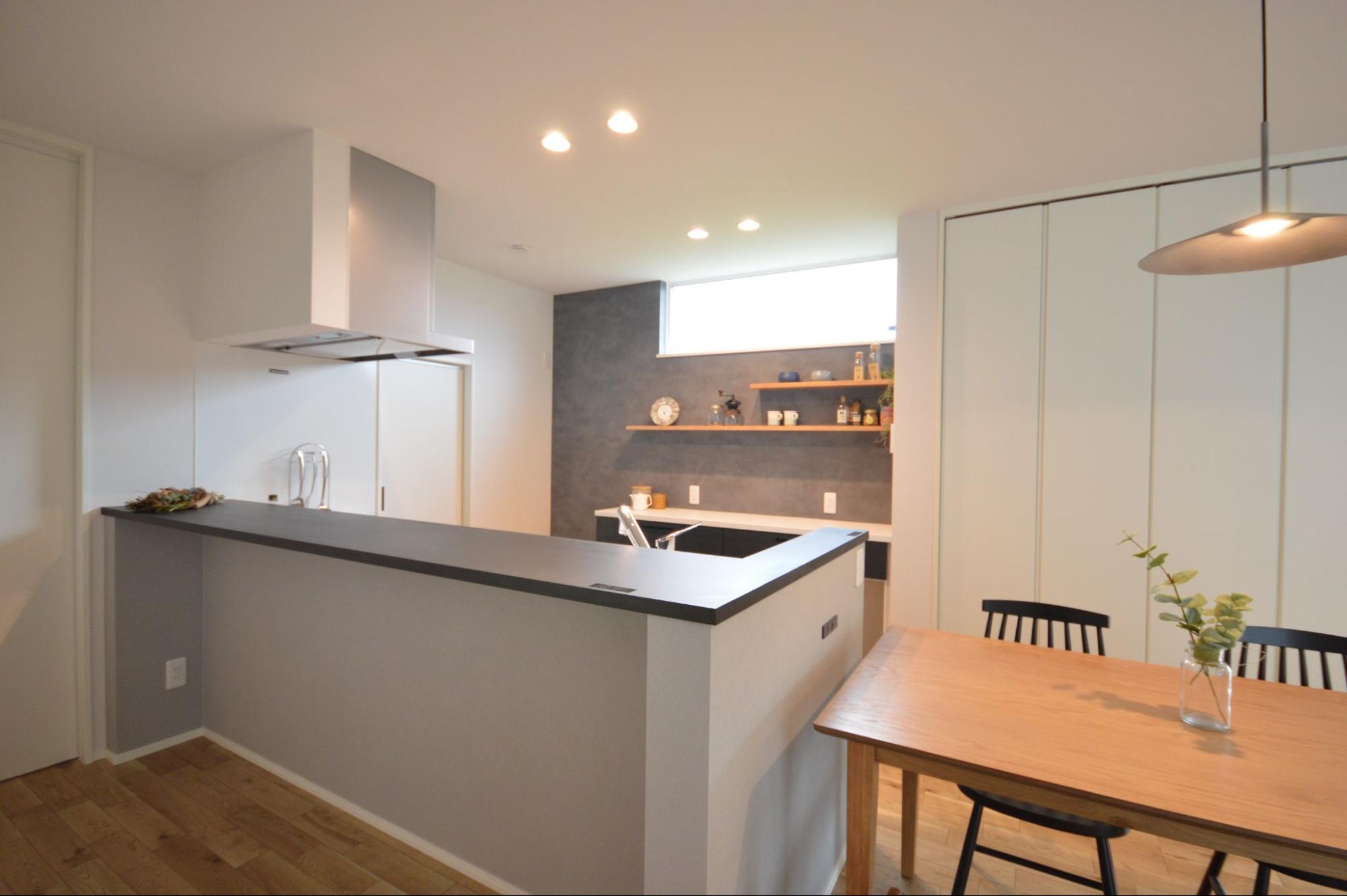 対面式キッチンの一つとして知られるペニンシュラキッチン。突き出した外観が半島(ペニンシュラ)に見えることから名づけられています。キッチンのカウンターの左右どちらかが壁に接している点が特徴的です。