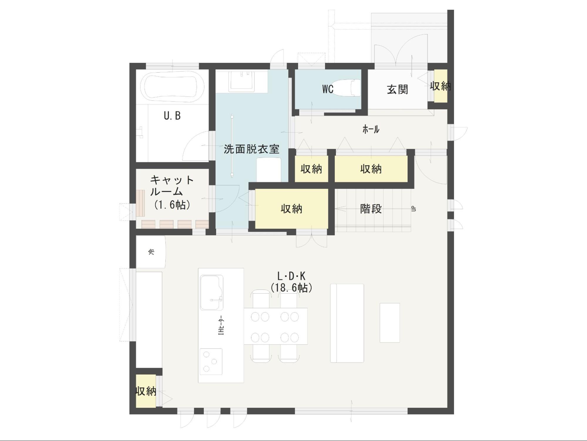 隣接する洗面脱衣所やキャットルームなどの行き来もしやすい間取りが特徴です。