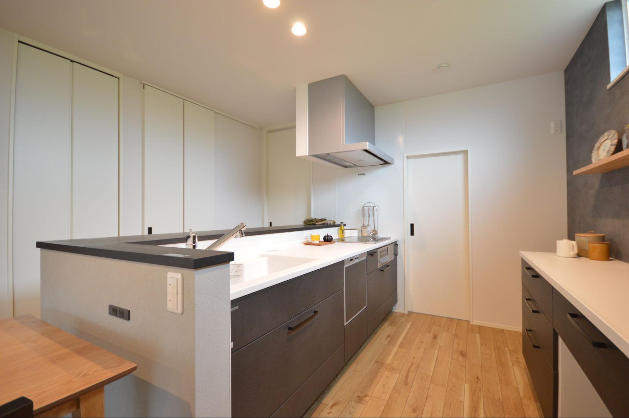 こちらの事例は、ペニンシュラキッチンとアイランドキッチンの特徴を取り入れた、ペニンシュラアイランド型の事例です。