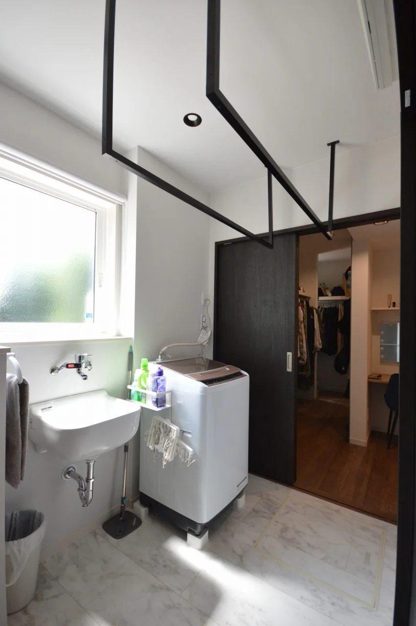 ランドリールームにはアイアンバーを3本設置しているので、たくさんの洗濯物を一度に干すことが可能。その奥には寝室へと続くウォークスルークローゼットを設け、洗濯から収納、着替えまでの動作を無駄なく完結できます。