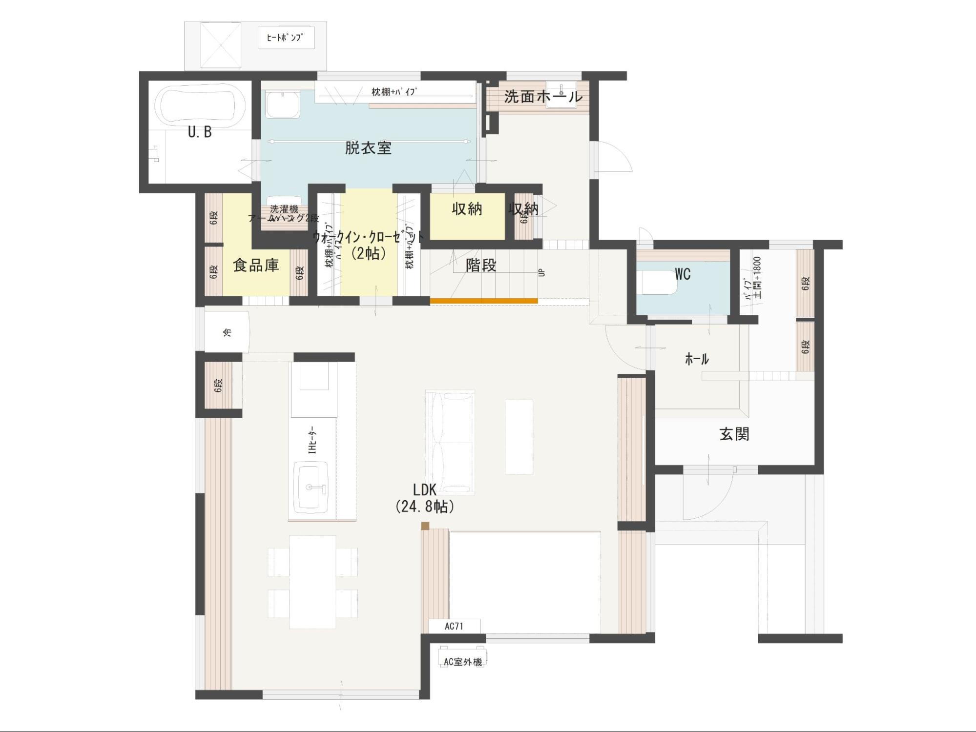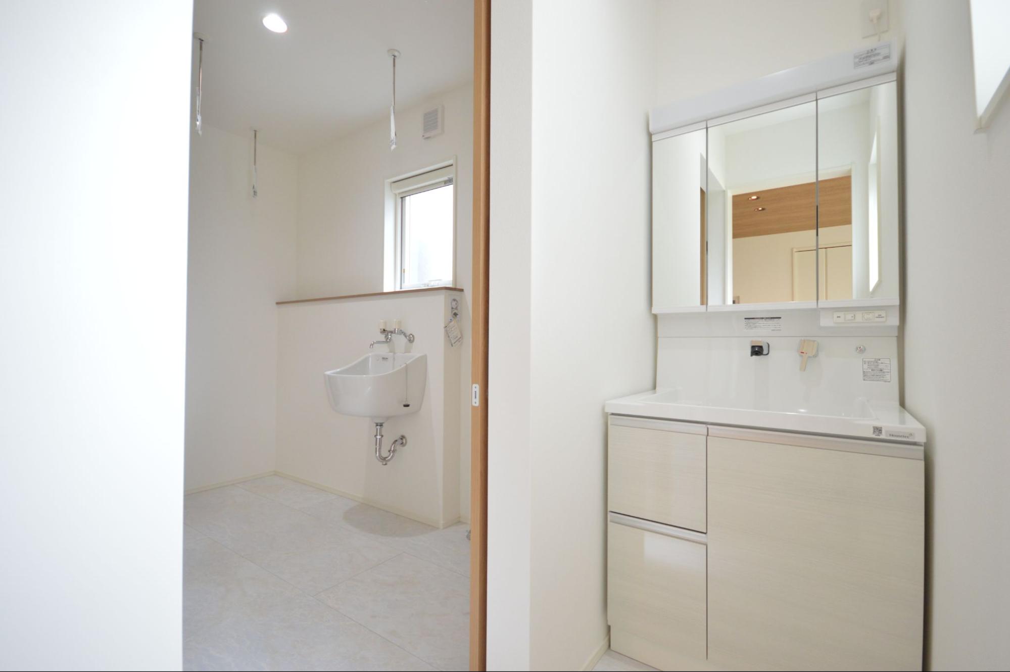 水回りを一直線に配置したことで、ランドリールームへの移動もスムーズに。家事効率が大幅に向上する動線となっています。