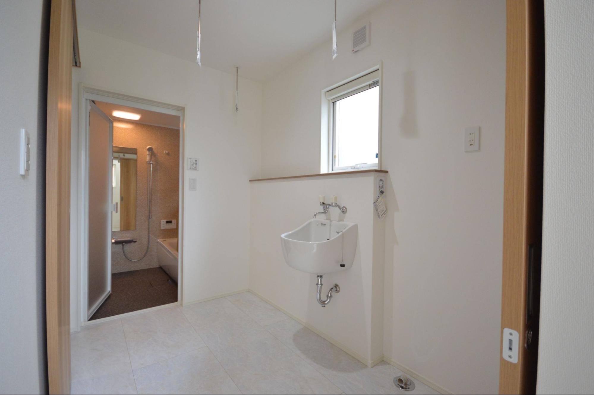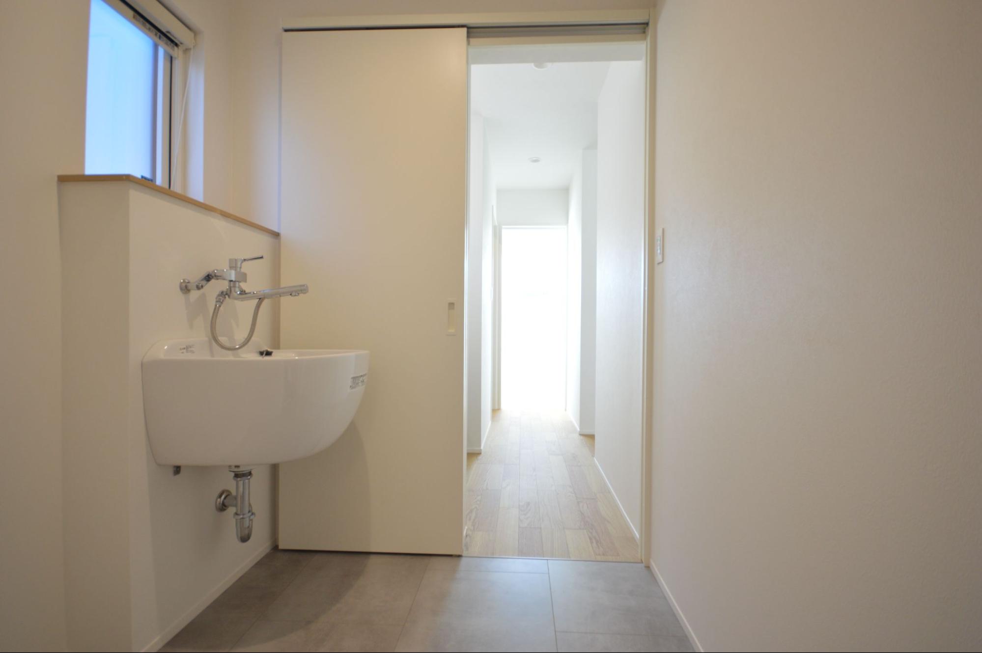 こちらは、脱衣室にスロップシンクを設置した事例です。濡れやすい洗い物をお風呂の近くでまとめて処理できる間取りとなっています。
