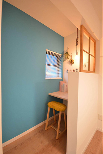 上記は2Fホールにオープンスペースを設けた間取りです。手洗いカウンターと兼ねているため、ドレッサーとしても使えます。吹抜けのあるプランで床暖房も採用しており、2Fホールでも快適に使えるカウンタースペースです。