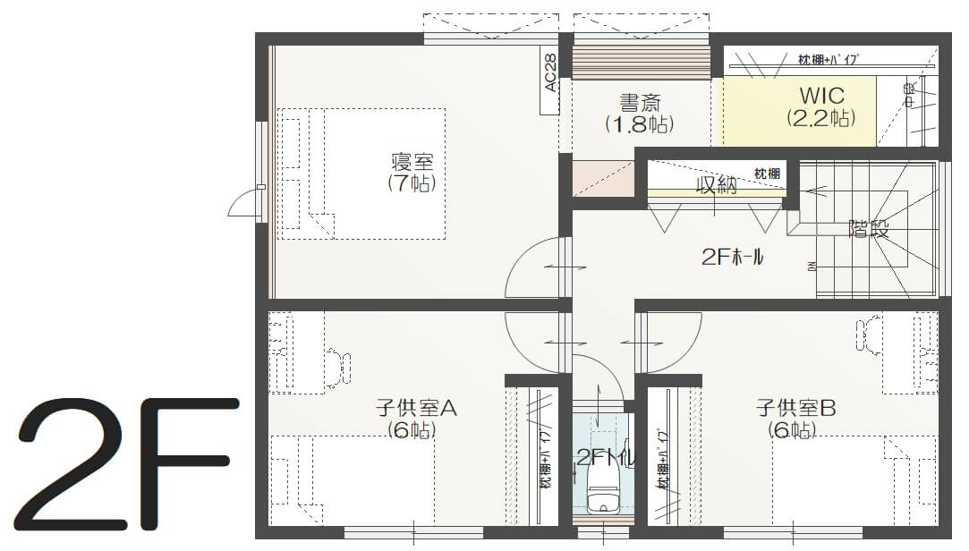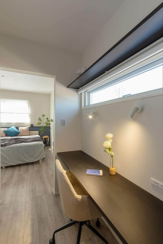 半個室型は建築コストを抑えながら、仕事に集中できる環境を作れる点がメリットです。後述するオープンスペース型も同様にスペースを有効活用する間取りですが、半個室型はよりセキュリティ性面に優れており、ウェブ会議がしやすい特徴があります。また、寝室と書斎で冷暖房を共有できるため、小さな書斎用にエアコンを設置せずに済みます。
