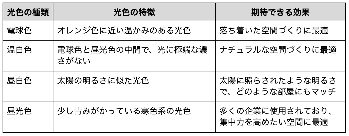 テレワークで使う照明は光色や明るさを基準に選ぶことが大切です。照明の光色は主に4種類あり、それぞれ期待できる効果が下表のように異なります。