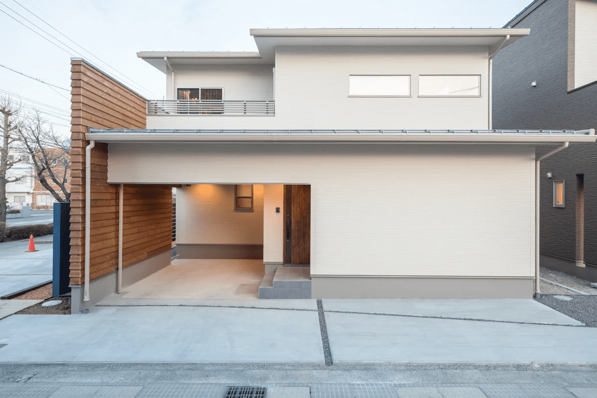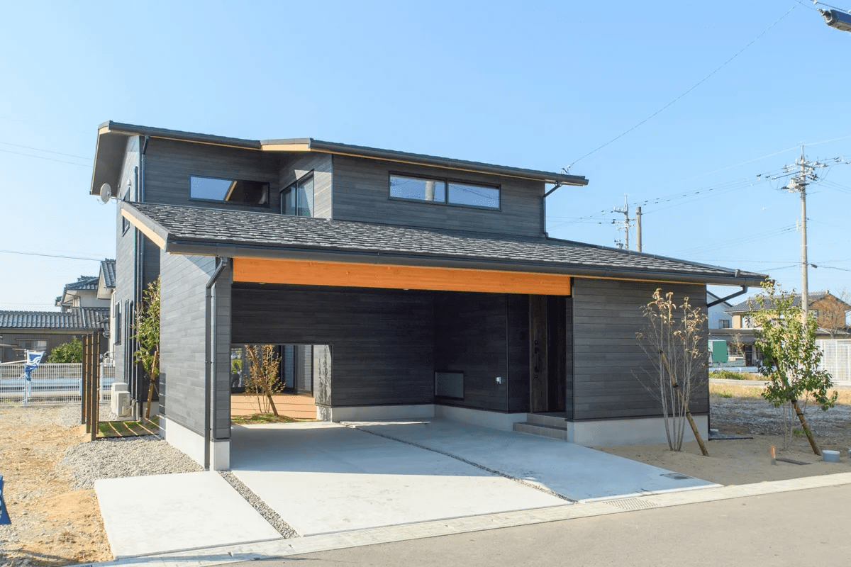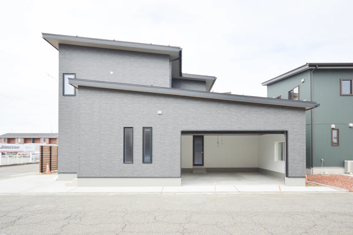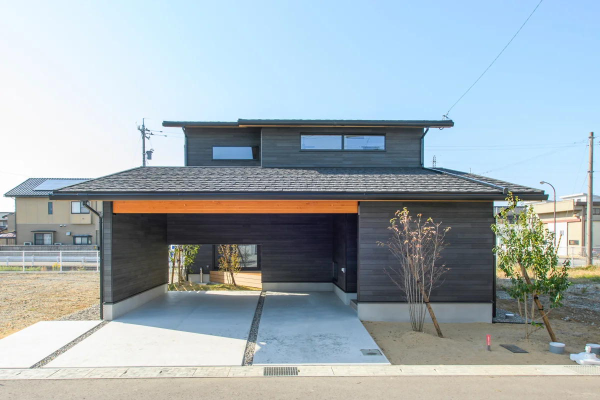 このインナーガレージハウスは、和モダンの外観と開放的な空間が特徴です。施主様のご要望により、一戸建てと一体化したガレージを設計しました。