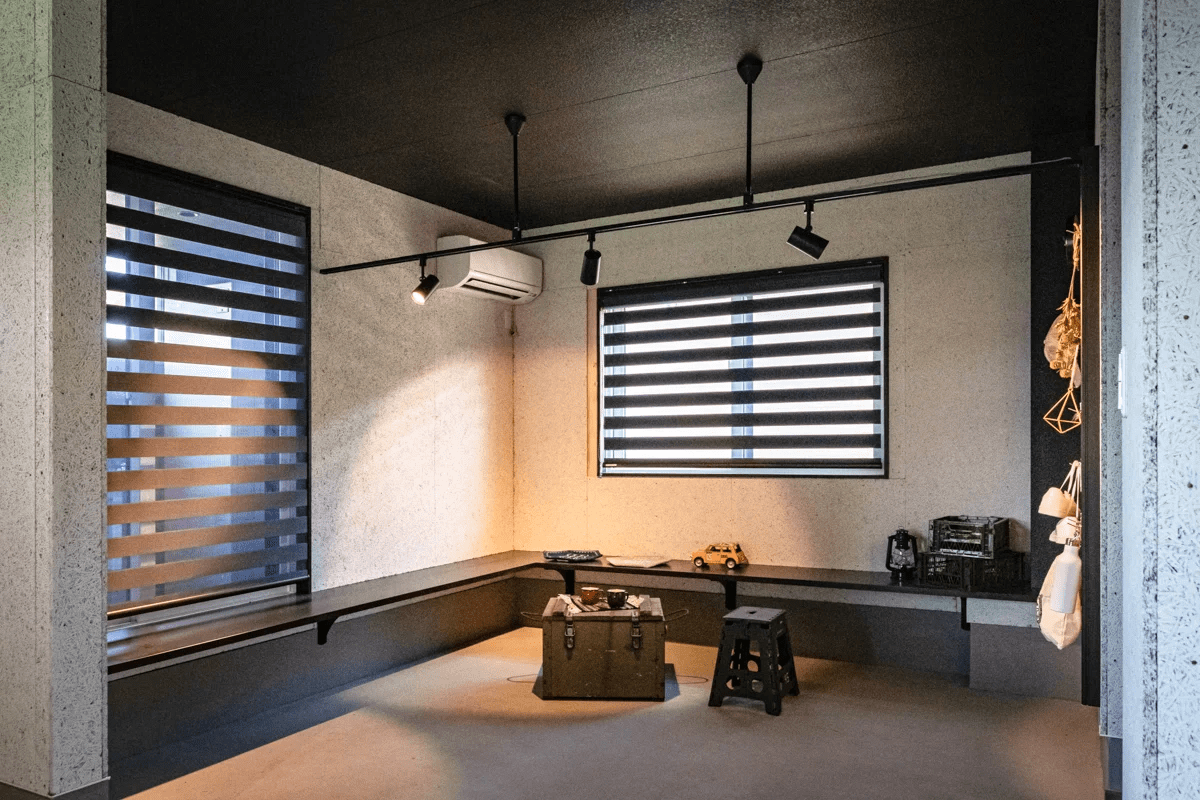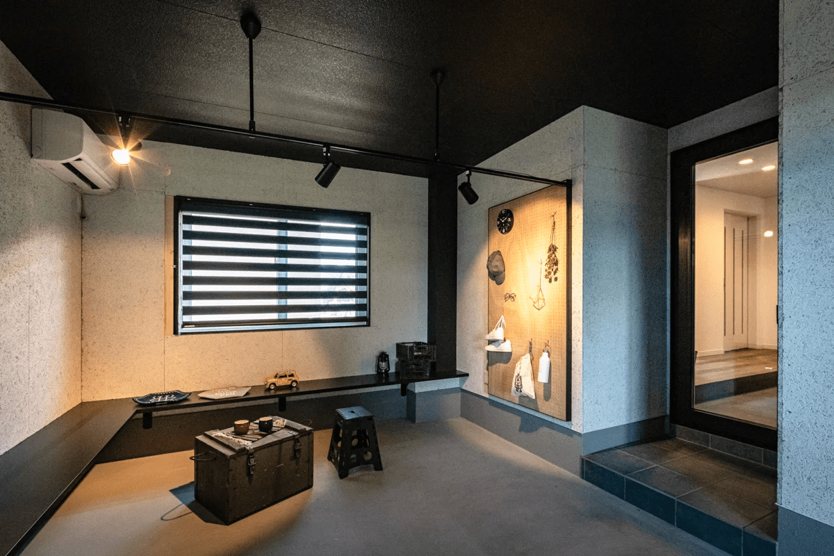 ビルトインガレージ内にラウンジがある住宅