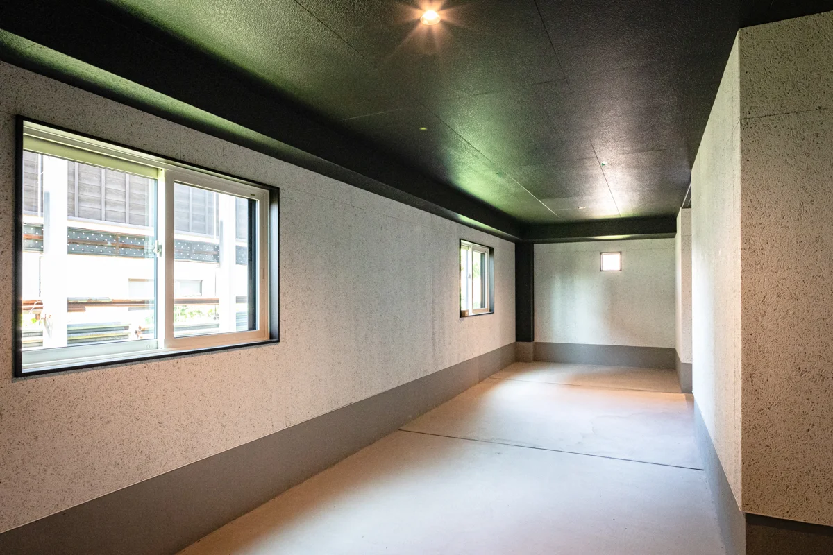 ラウンジスペースの反対側にはピロティ空間を設け、使用頻度が低い物やディスプレイスペースとして活用できます。給湯器も設置し、雪対策にも役立てています。
