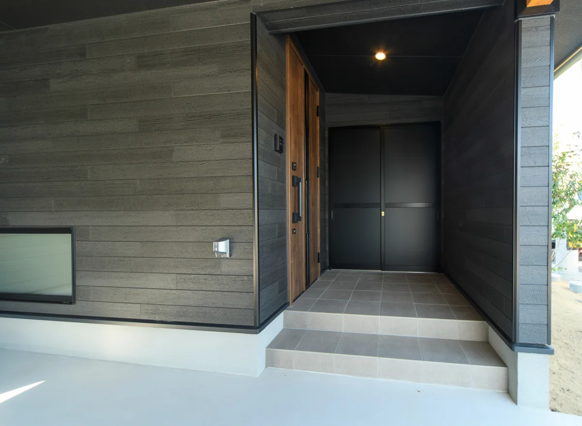 ガレージから玄関に入れるように設計されています。玄関の扉の横に外部収納スペースもあります。