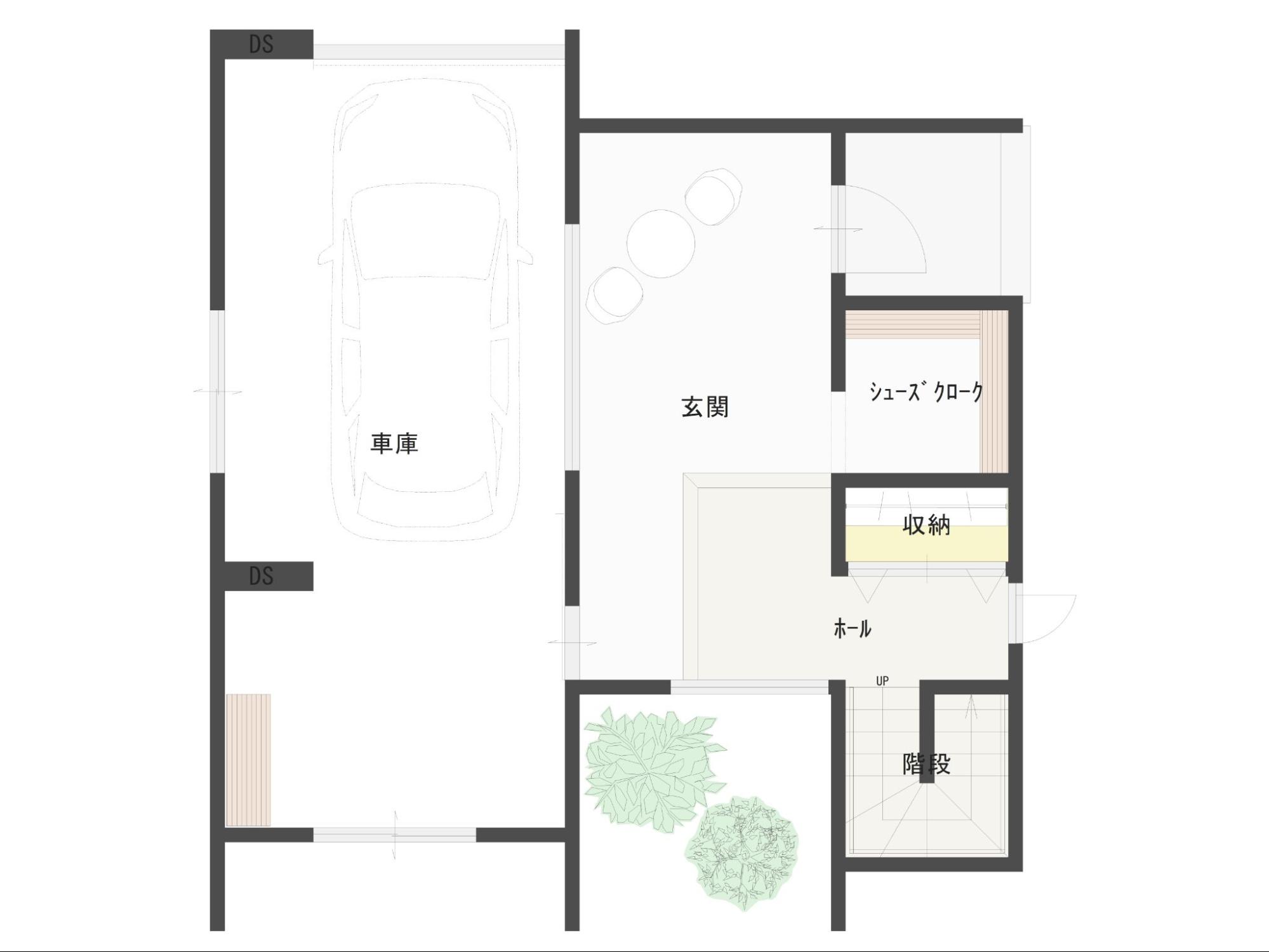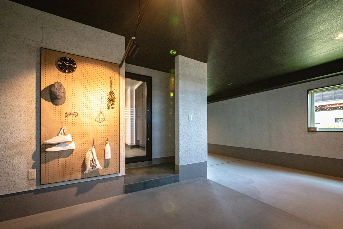 この家は、シャッター付きのインナーガレージハウスです。2台分の駐車スペースを確保しつつ、ガレージから室内への動線を2つ設け、帰宅動線を効率化しました。