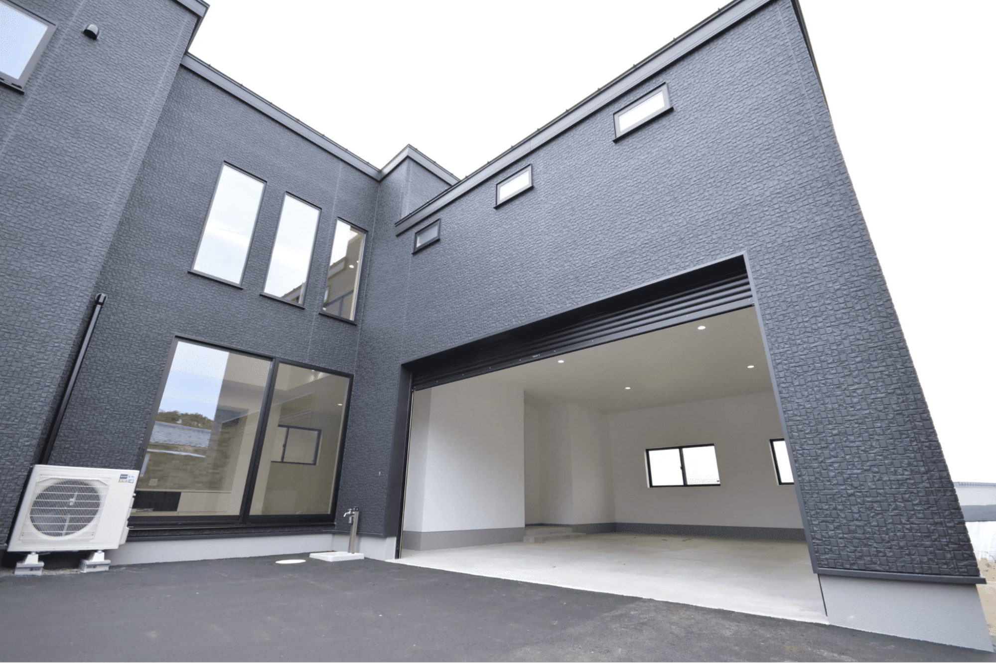 ビルトインガレージと屋根なしの駐車スペースを併用した住宅
