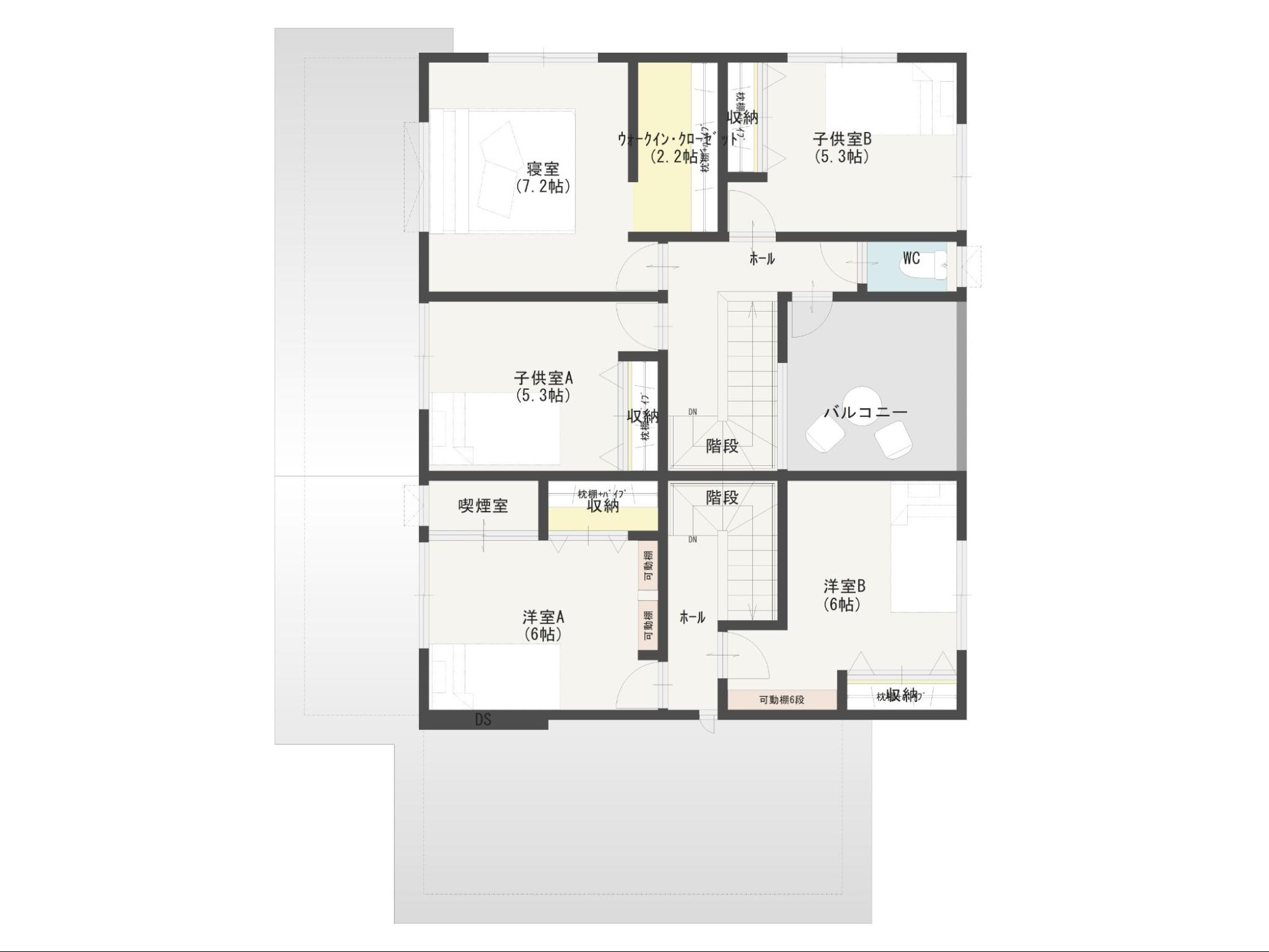 完全共有型の二世帯住宅とは、個室(部屋)を多くし、LDK・水回りなどは全て共用とした間取りです。家族が顔を合わせる機会が必然的に多くなるため、同居感が強く、コミュニケーションが活発になりやすいのが特徴です。