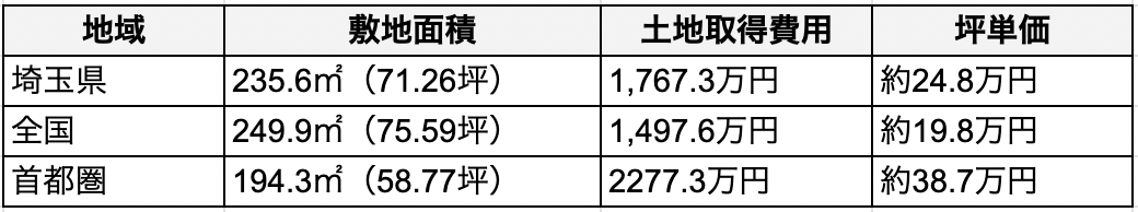埼玉県の坪単価は約24.8万円。全国平均の約19.8万円と比べると割高ですが、首都圏平均の約38.7万円に比べると、13万円以上割安です。さらに、敷地面積は235.6㎡(71.26坪)と、首都圏の平均よりも12坪以上の広さです。このことから、埼玉県では広い土地を安く取得できることがわかります。