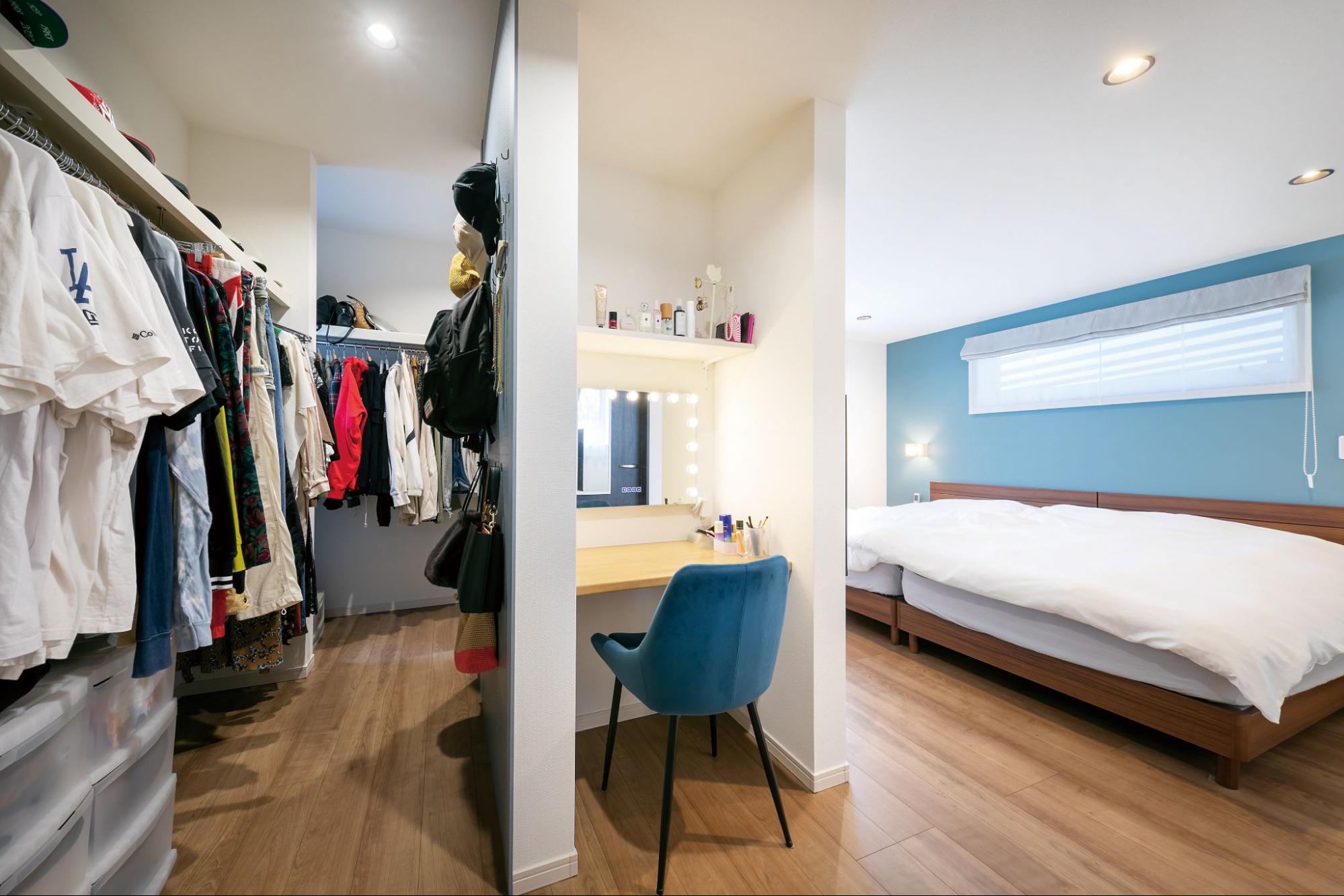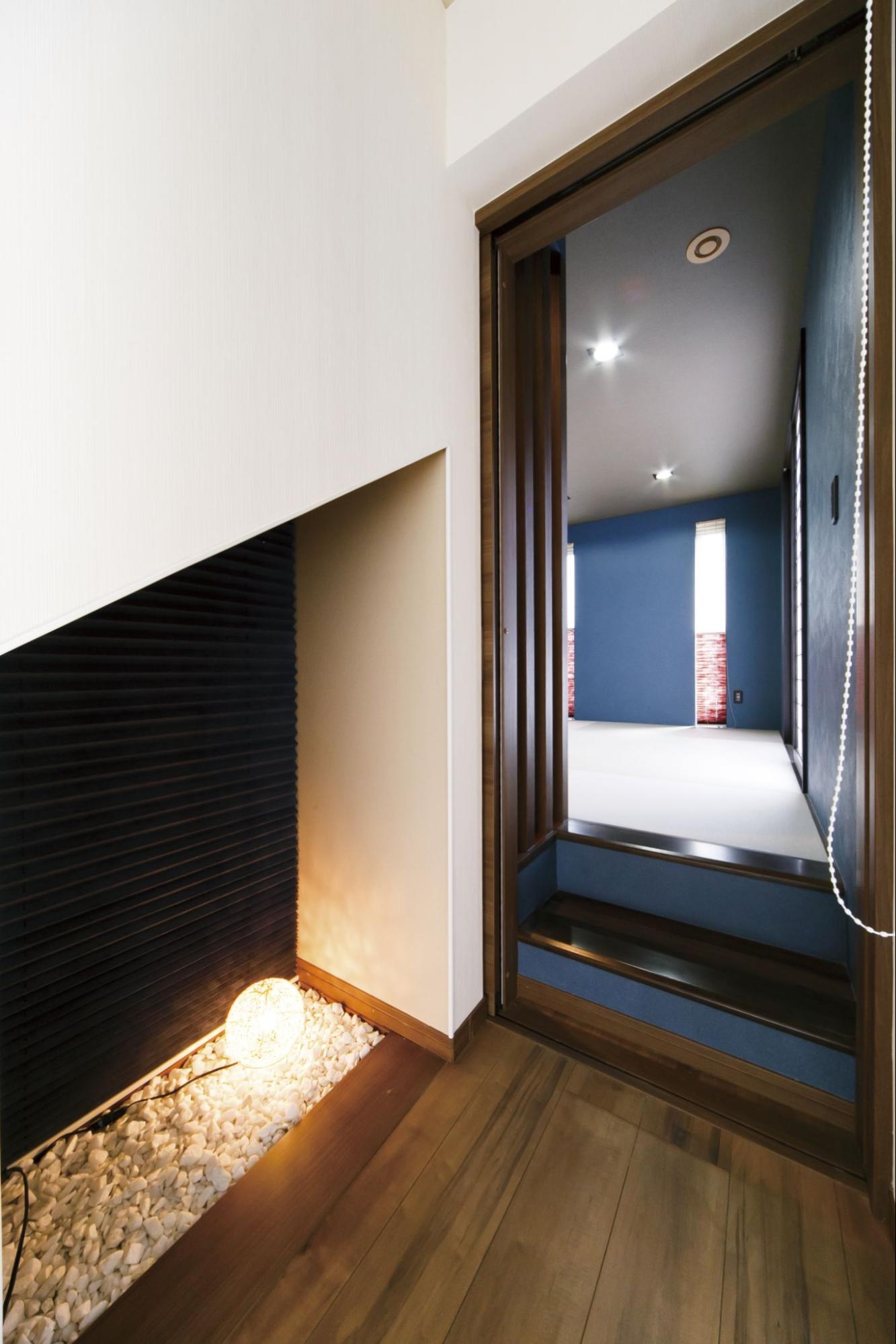 玄関を入ってすぐの場所には、落ち着いた青色の壁紙で統一された6畳の和室を配置。上品な和の雰囲気が漂い、訪れる人をやさしく迎えます。