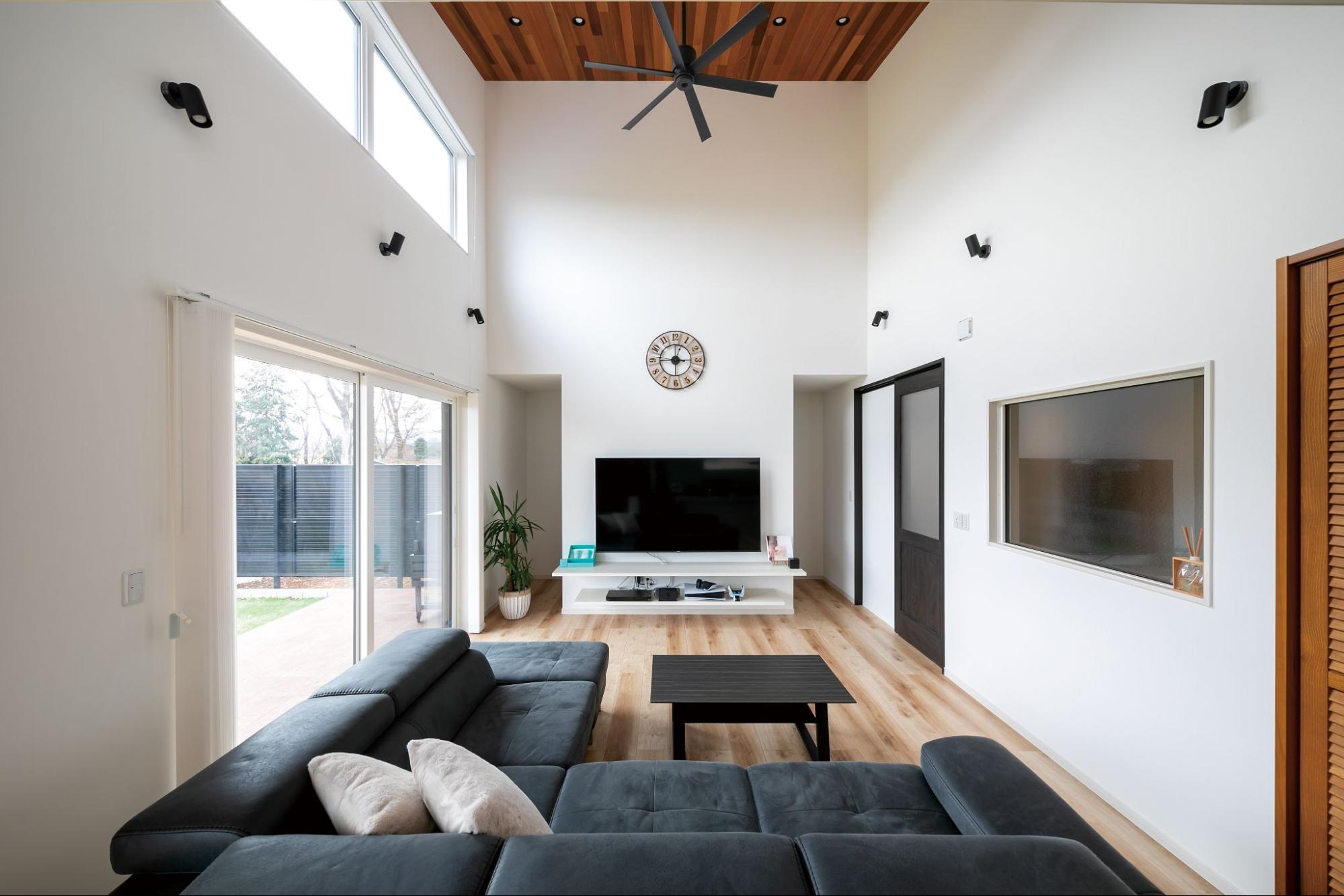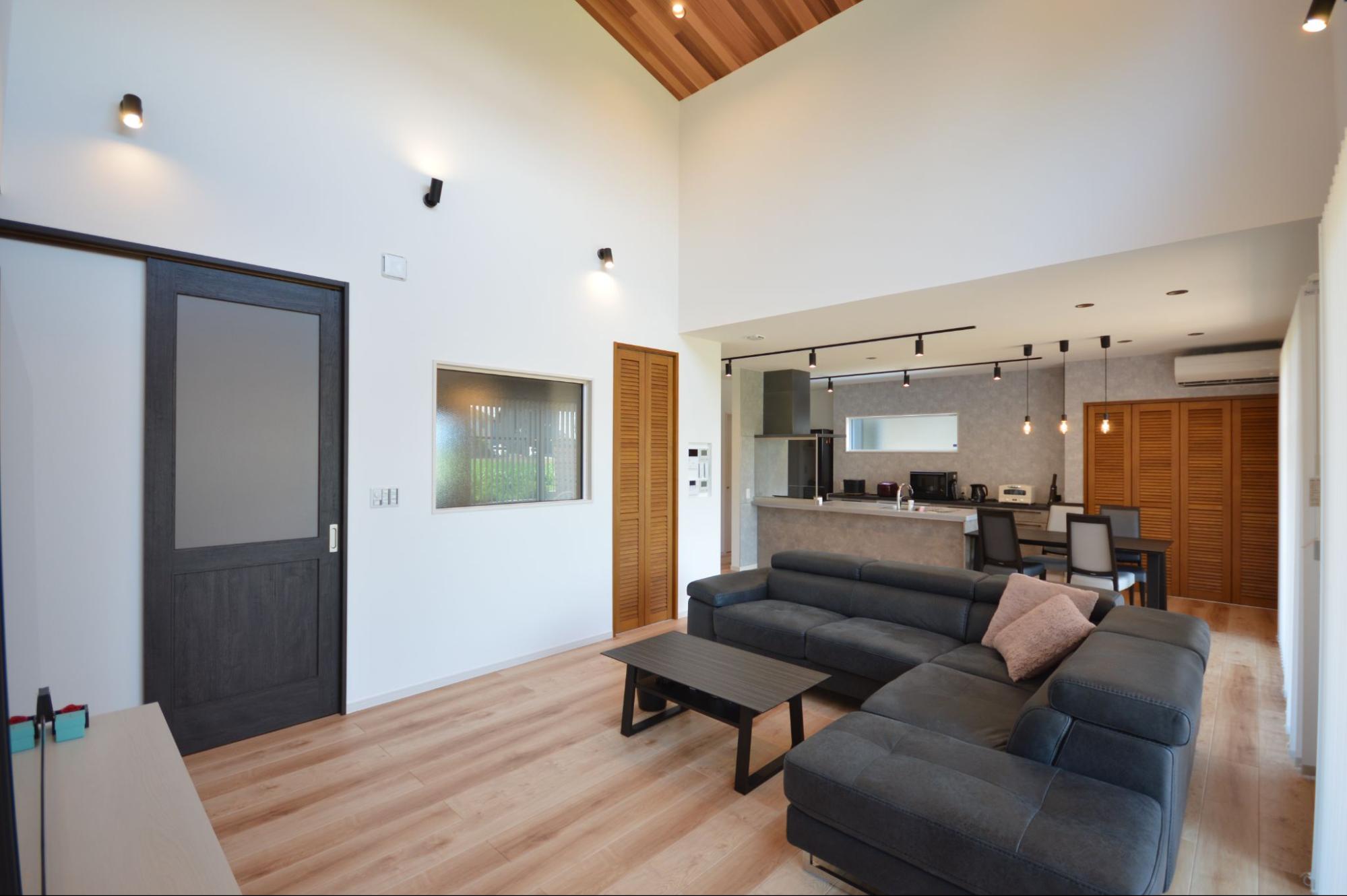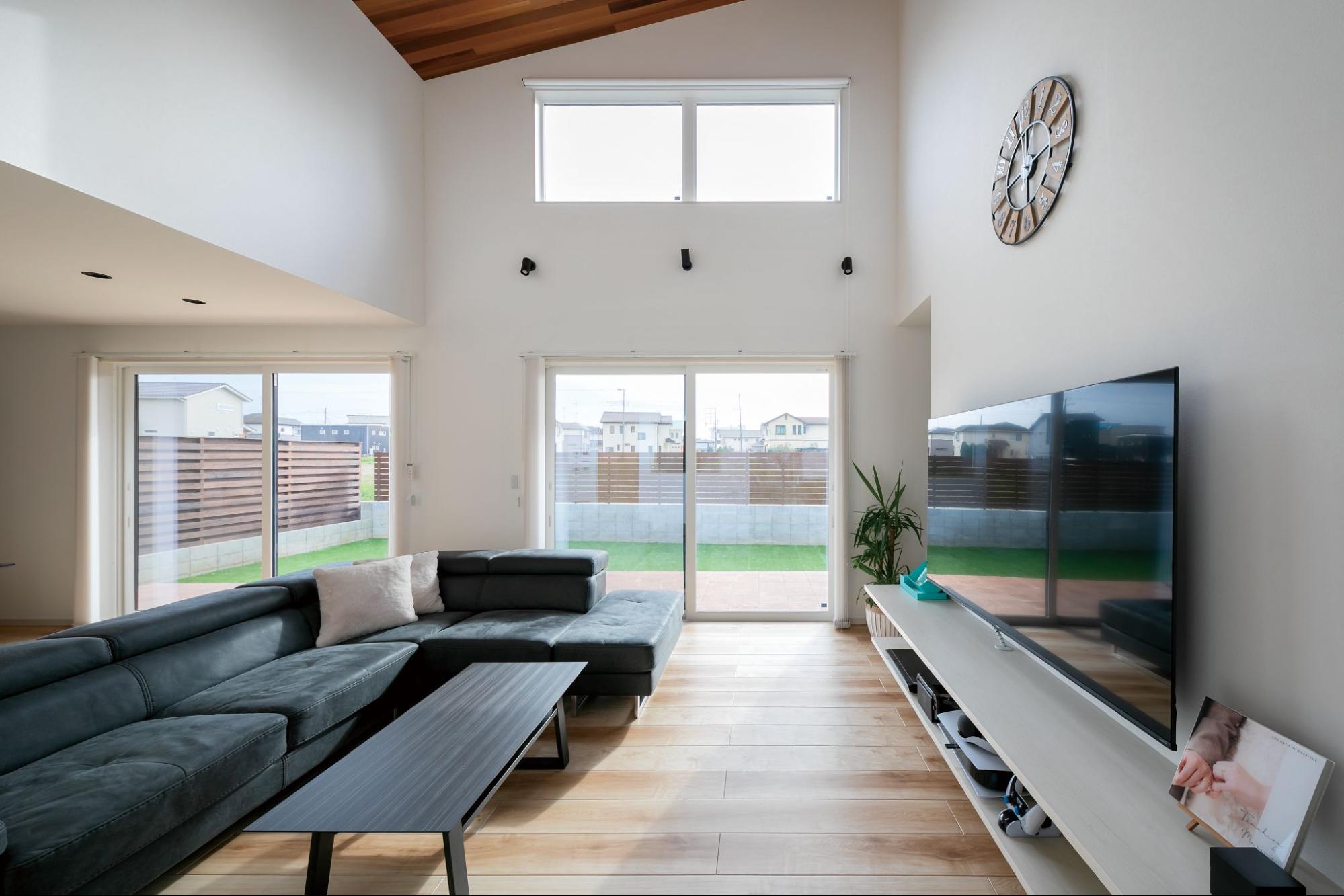 リビングは勾配天井と大開口の窓が配置され、開放感たっぷり。LDKが一体となり、家族が自然と集まる場所になっています。