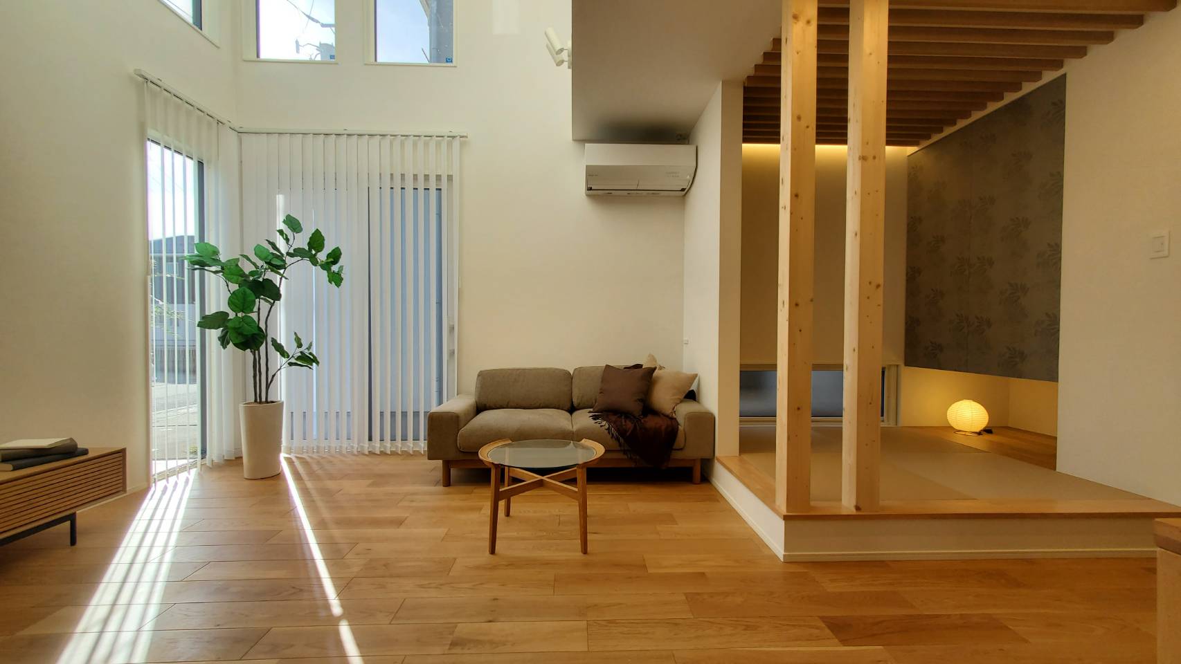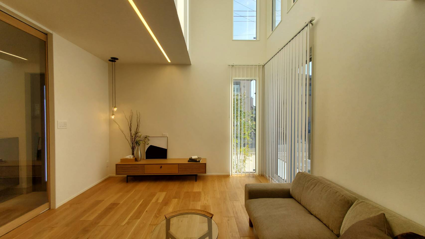 吹き抜けのあるリビングは、大きな窓から光が差し込み、住宅地にいながらも明るく広がりを感じられる空間です。