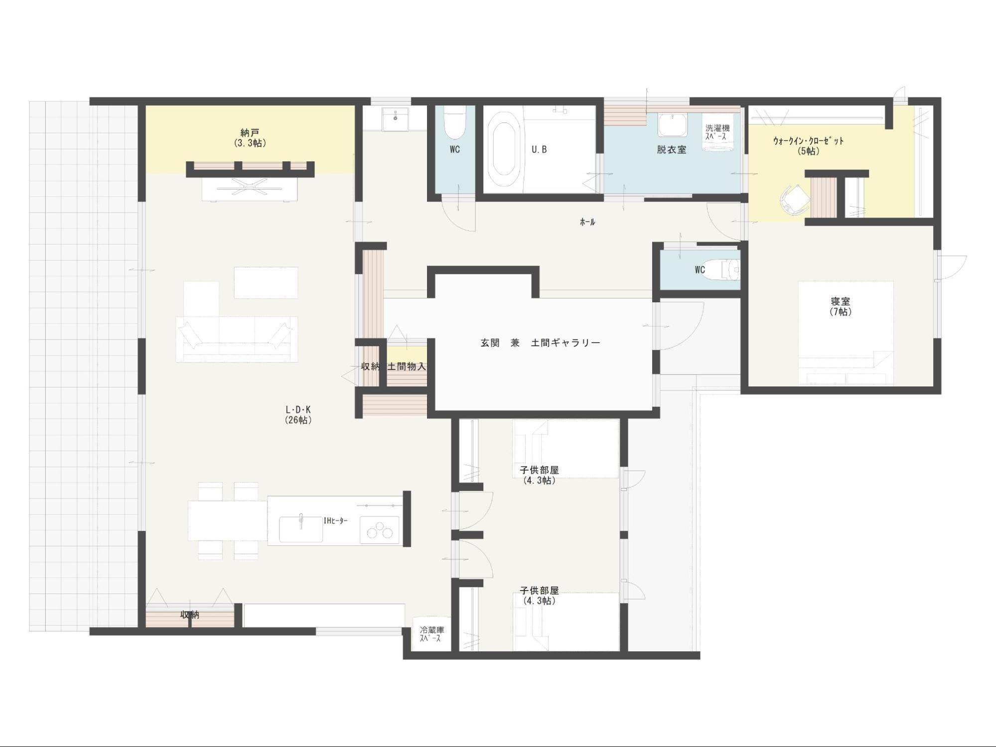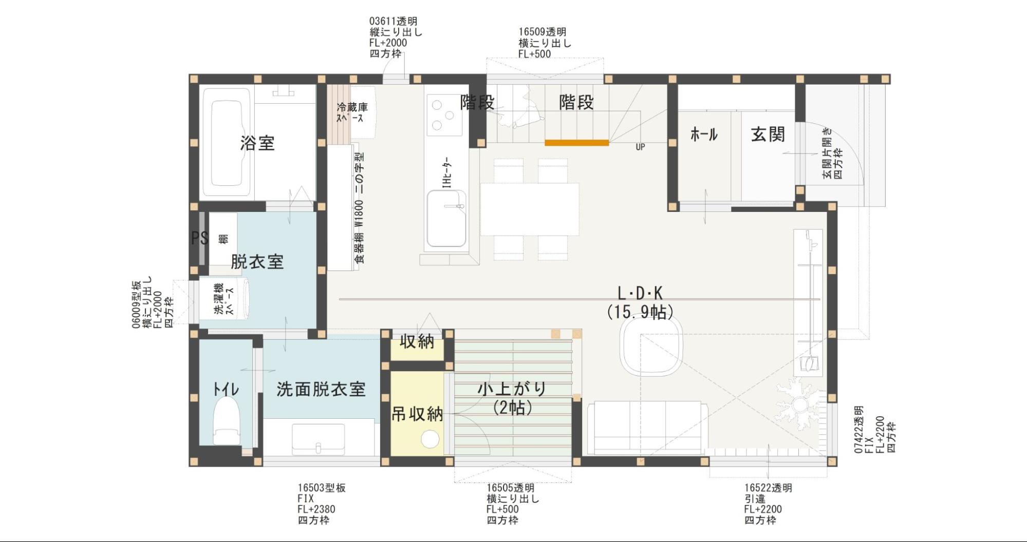 ワンフロアで生活が完結するため、移動が楽で家事動線もスムーズ。裏庭にドッグランを作って、外との繋がりも楽しめます。断熱性や通風を意識した設計で、暑さ・寒さにも対応できる快適な住まいを実現できます。