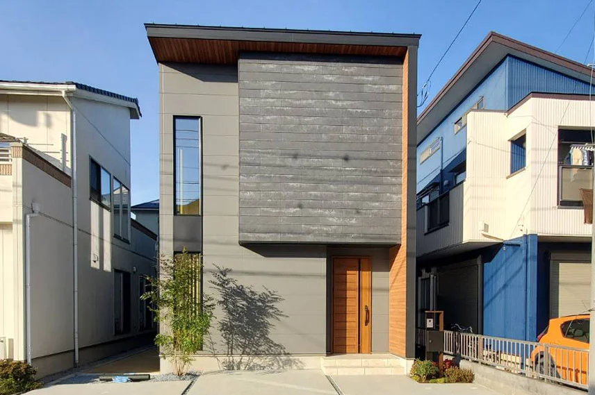 コンパクトな2階建てながら、開放感と暮らしやすさを両立した住まい。外観にはKMEW製のSOLIDをアクセントに使い、木目のやさしさが感じられる洗練されたデザインが印象的です。