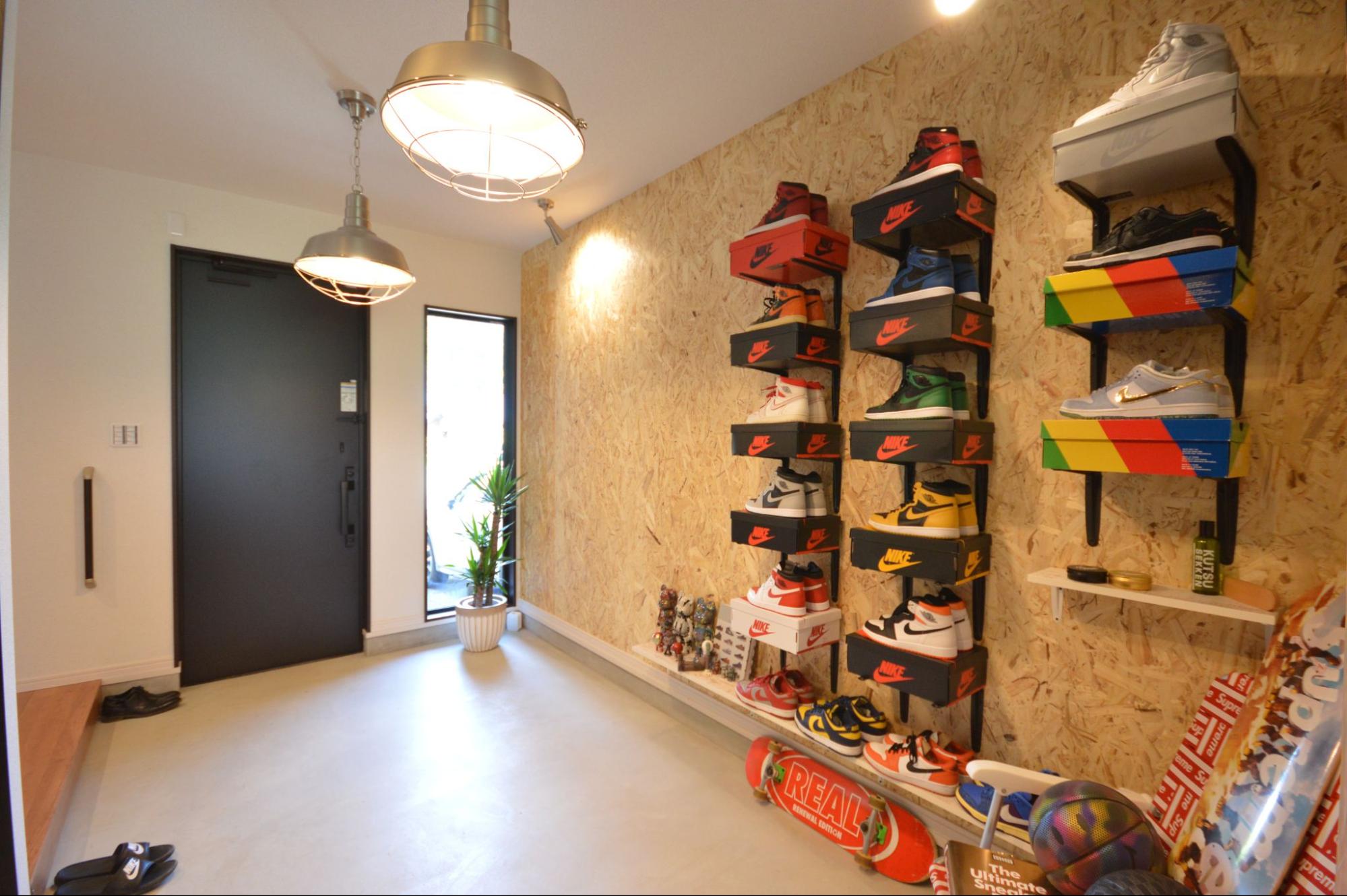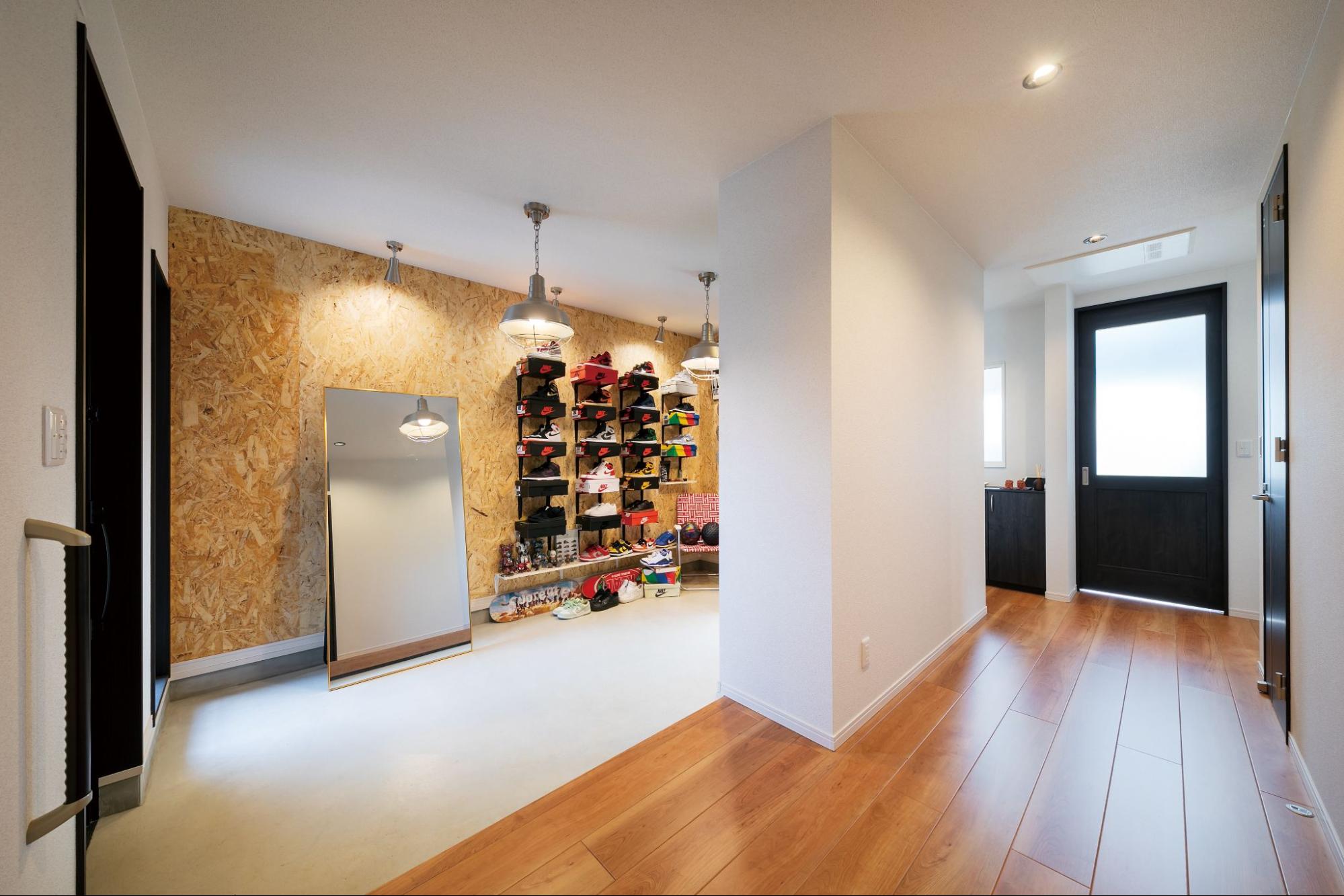 広々とした玄関スペースには趣味のアイテムを飾れる棚や作業スペースを設け、訪れる人にも趣味や個性が伝わるつくりに。