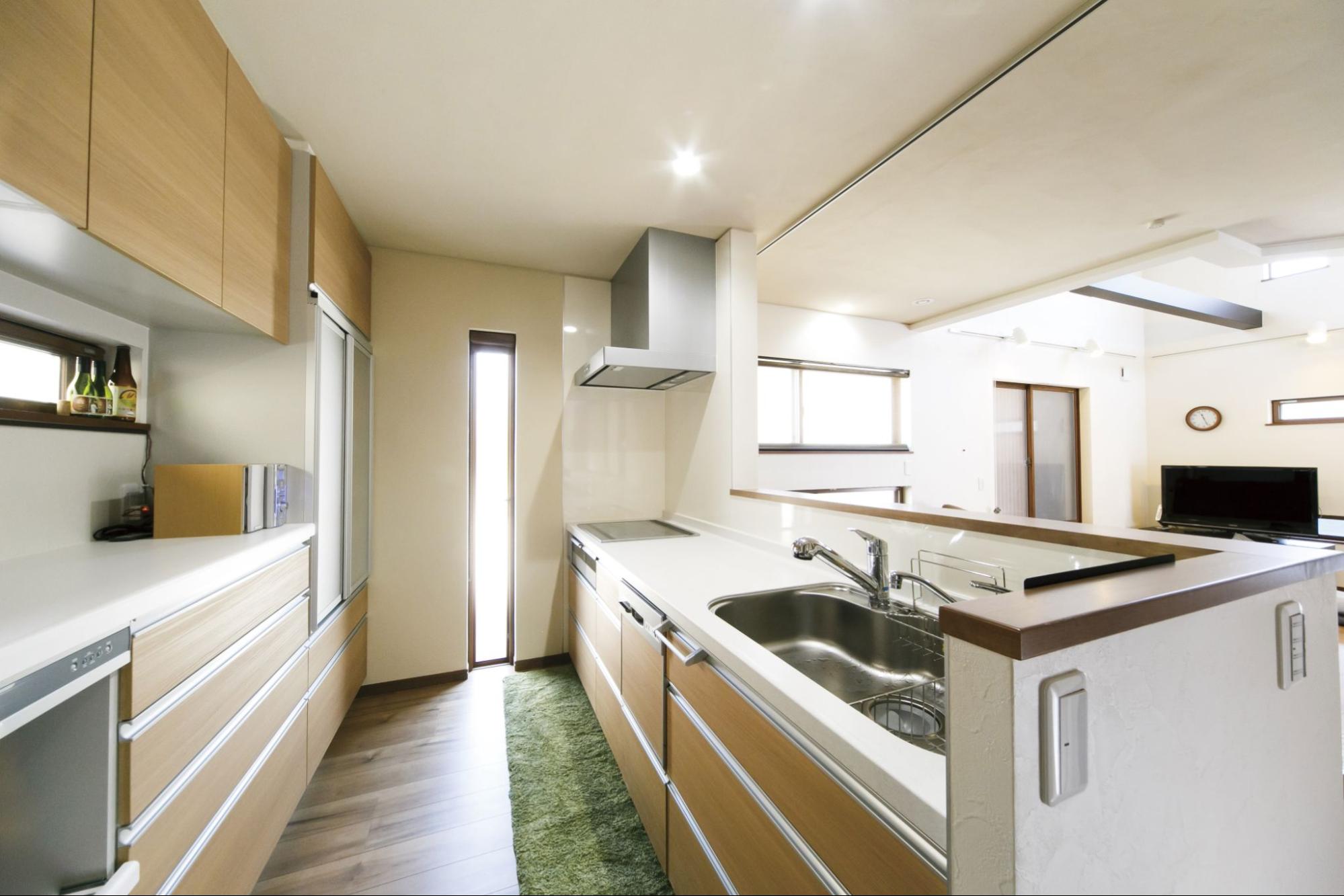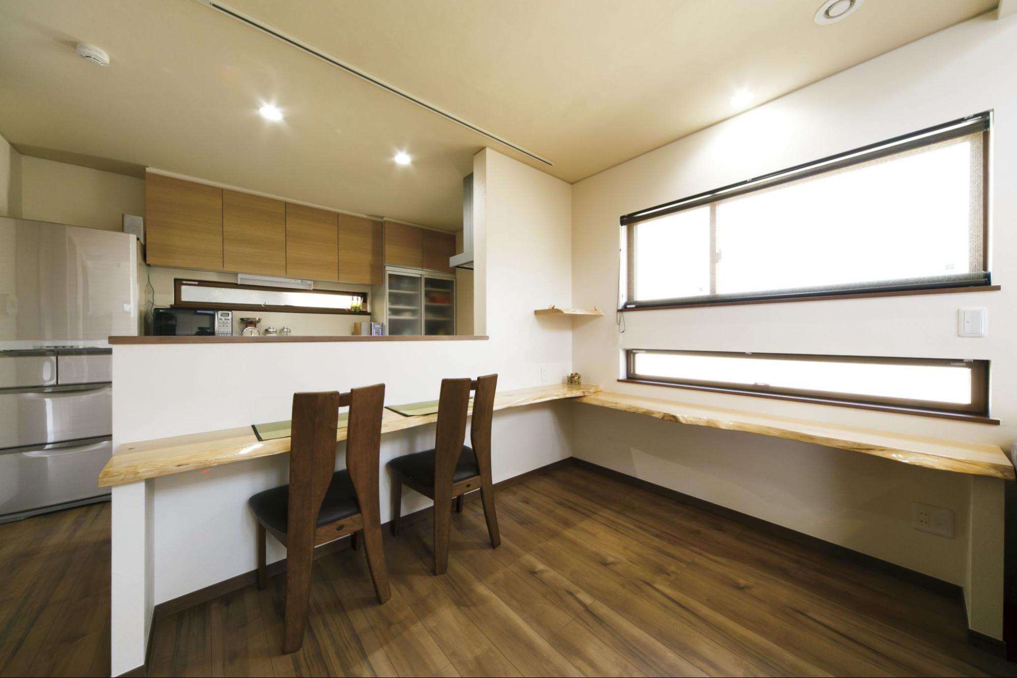 キッチンには一枚板のカウンターを使用し、作業スペースを確保しながらも開放的なつくりに。